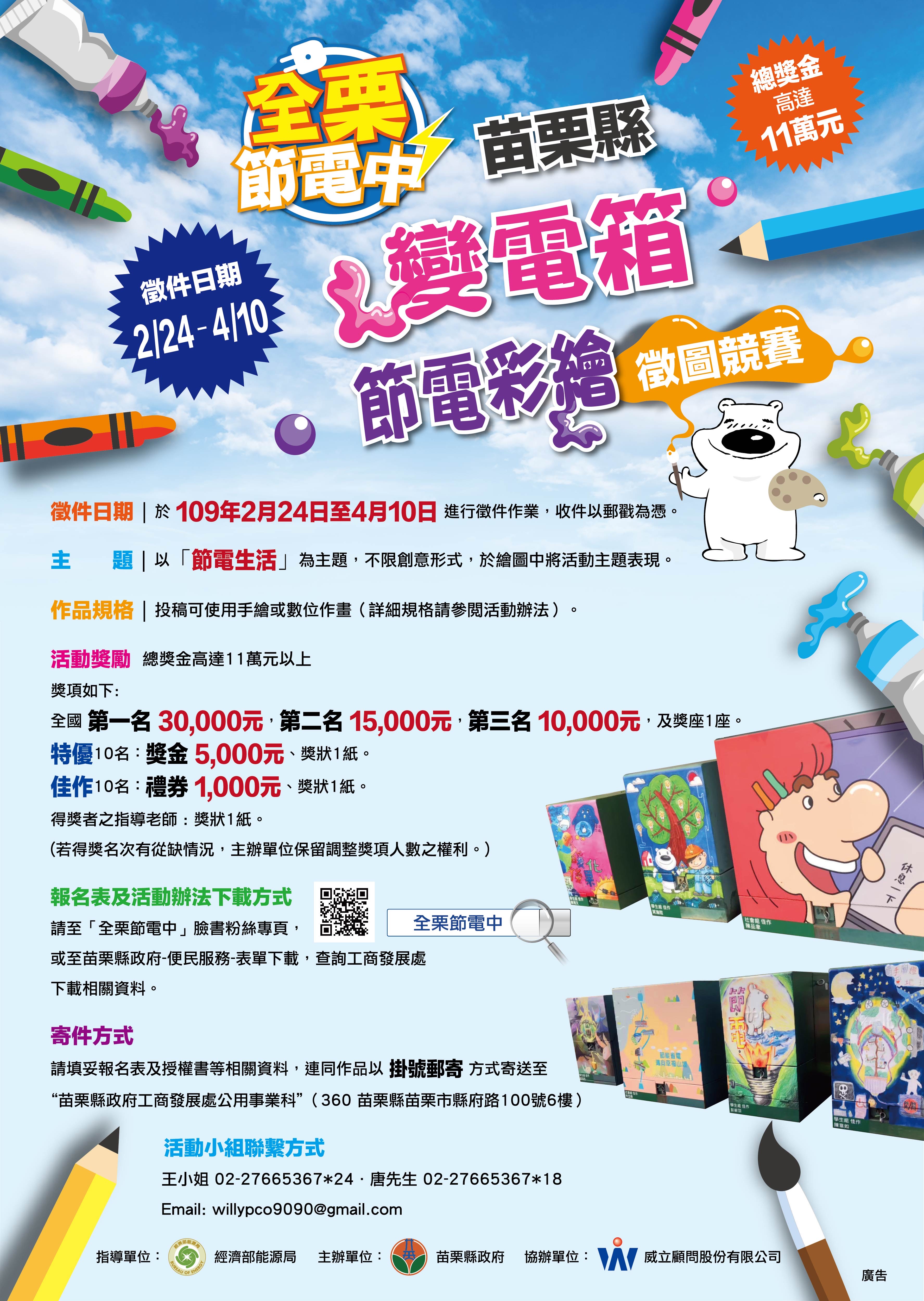 为提升全民节电意识,苗栗县政府特别举办「苗栗县变电箱 节电创意彩绘徵图竞赛」,绘画内容以「节电」为主题,并请选用「A4大小以上画纸」作画。