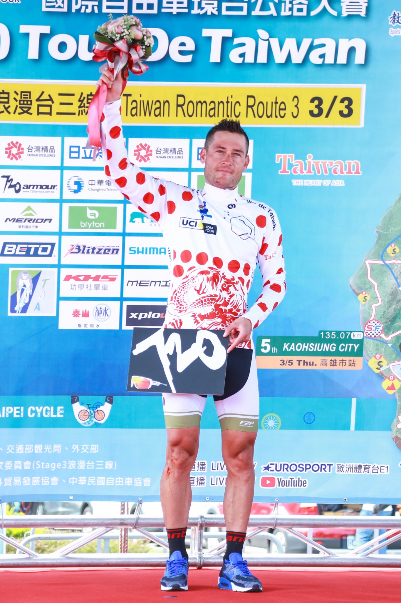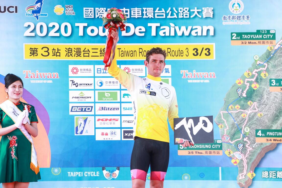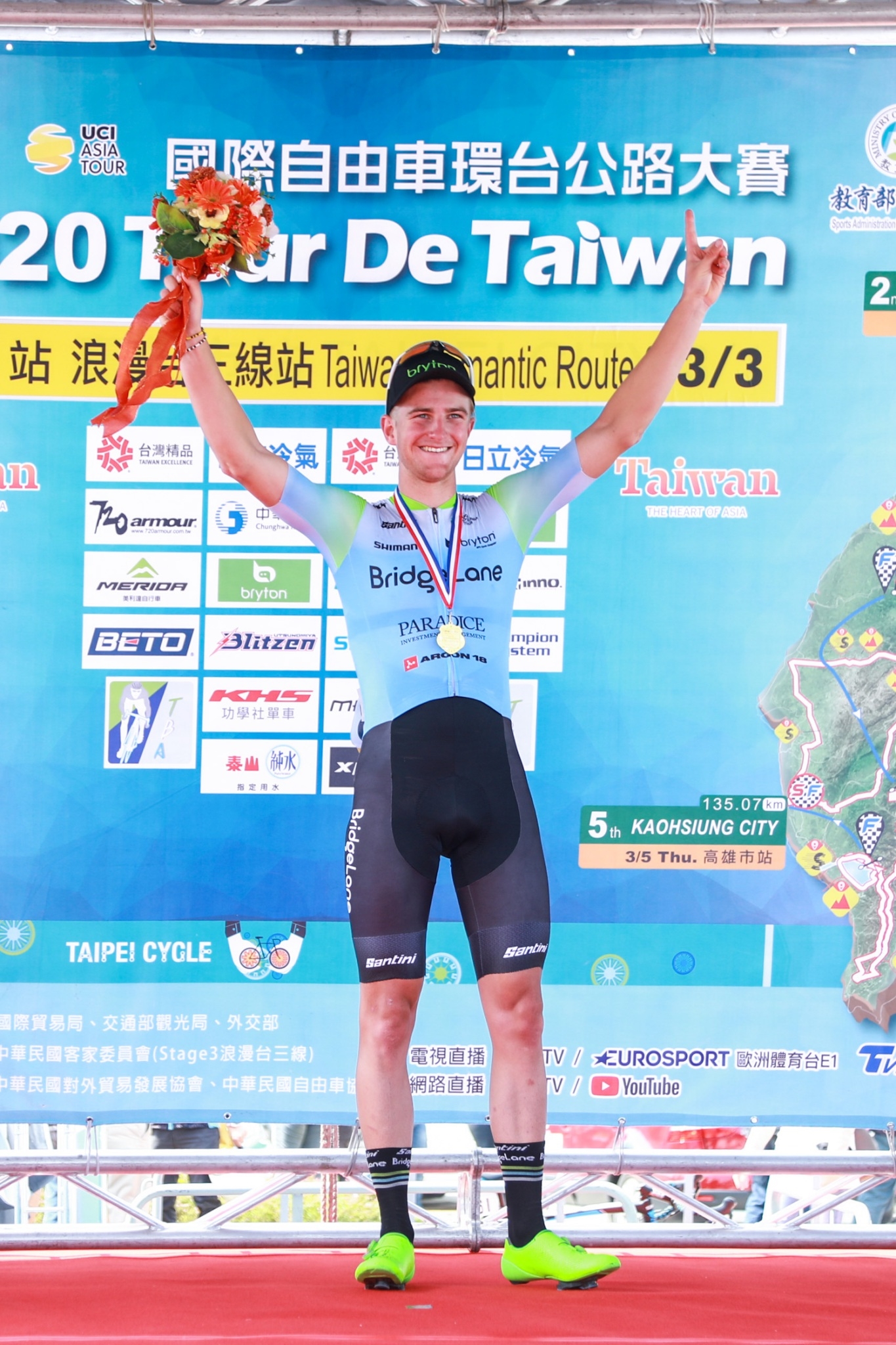 2020国际自由车环台公路大赛第3站「浪漫台3线站」今(3)日登场,吸引各国好手竞逐,最终由来自澳洲圣托斯车队的尼可拉斯(White Nicholas)勇夺冠军,来自台中的中华队选手冯俊凯今日也再度披上代表亚洲第一的蓝衫,续创佳绩。副市长陈子敬今日出席闭幕式,热情迎接选手冲刺终点,并推荐选手赛後顺道一览台中客庄美景,为当地观光做最佳代言。