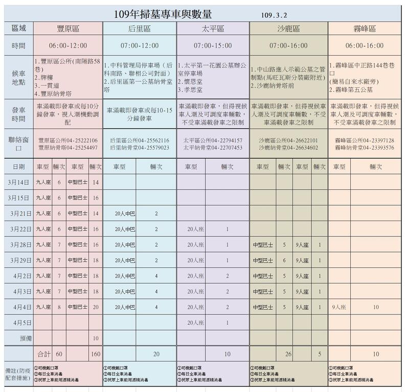 清明节将至,为方便民众祭祖扫墓,台中市政府民政局自3月14日至4月5日,於丰原、后里、太平、沙鹿及雾峰区提供清明扫墓接驳专车,免费接送扫墓民众往返墓区。