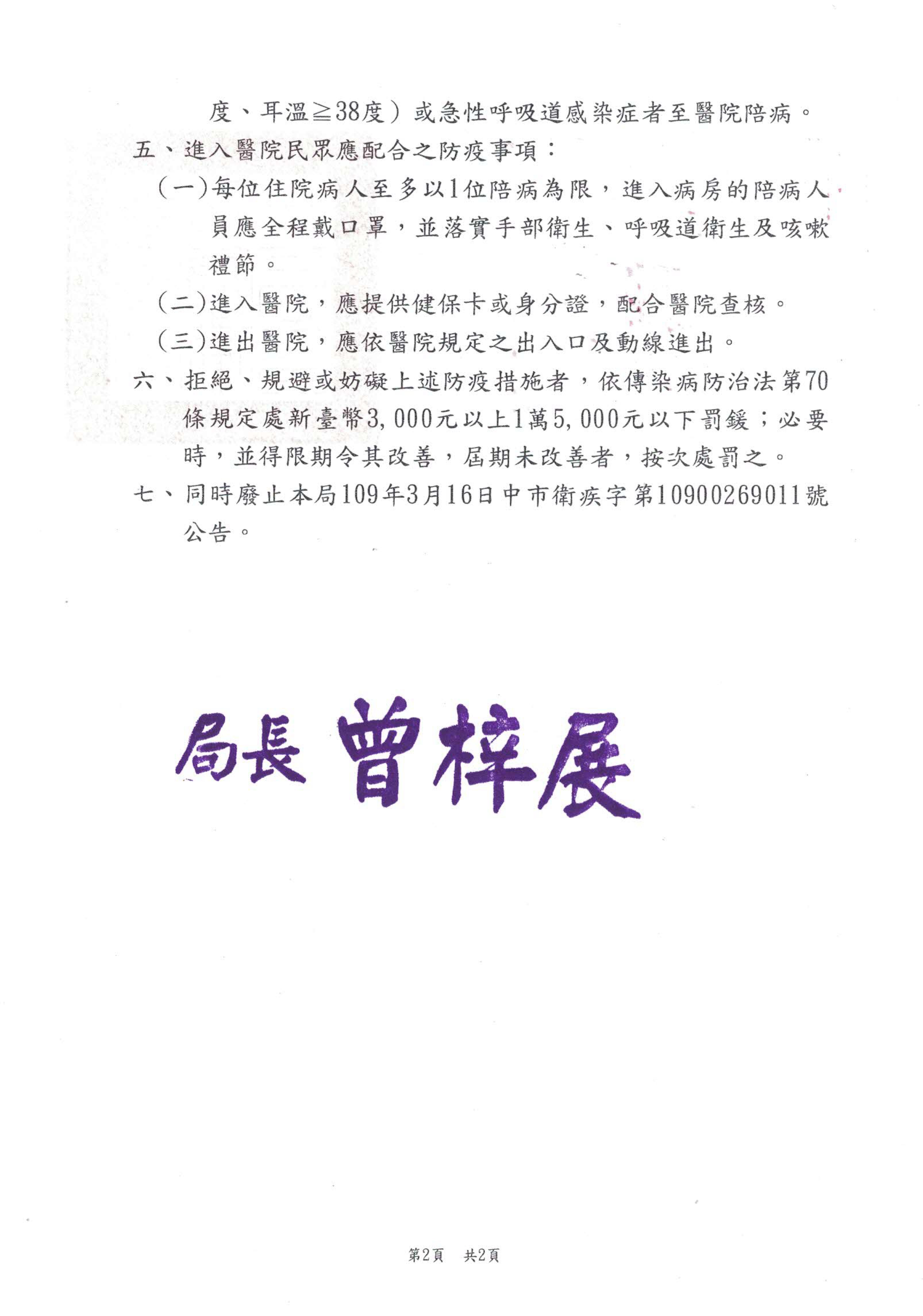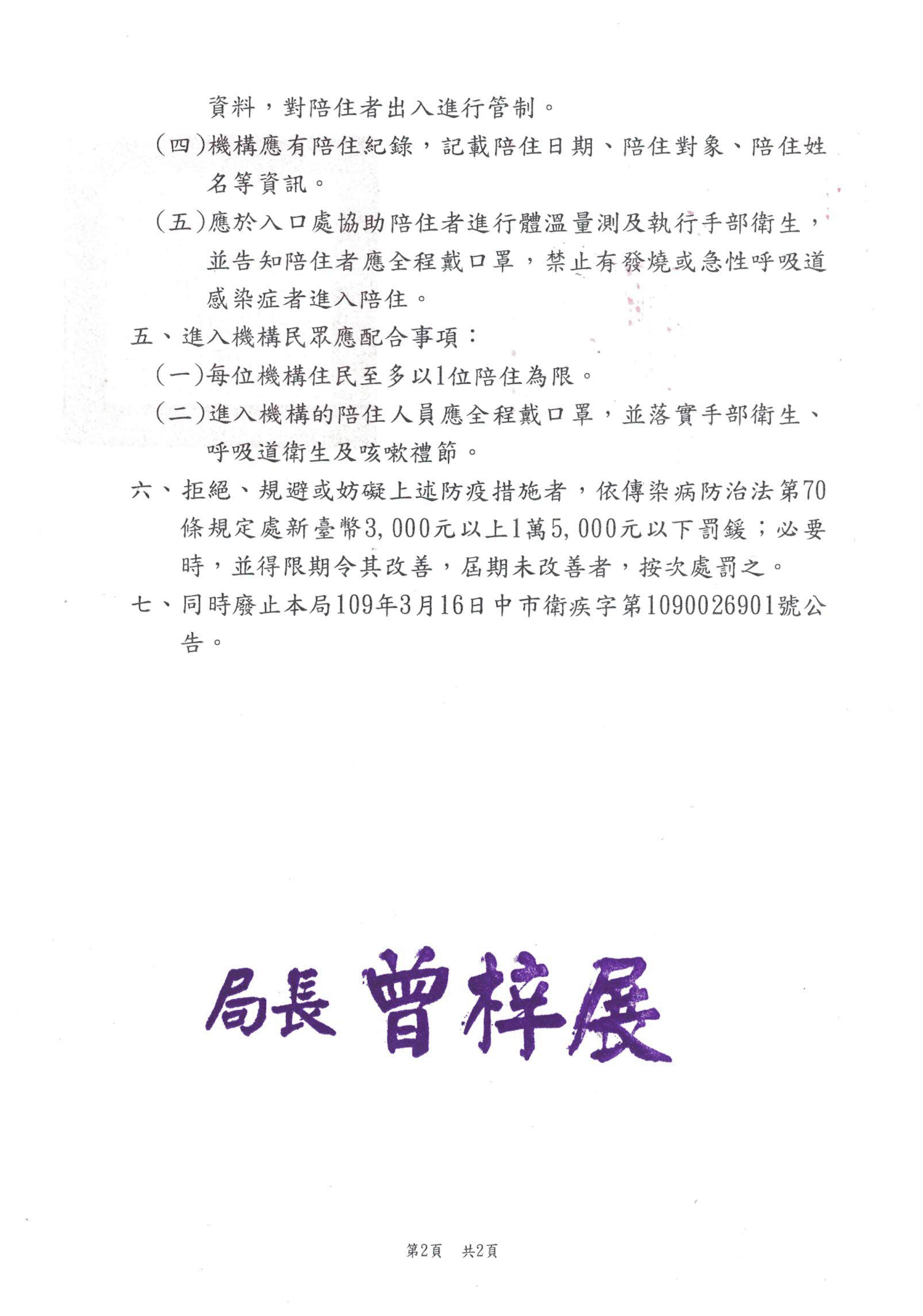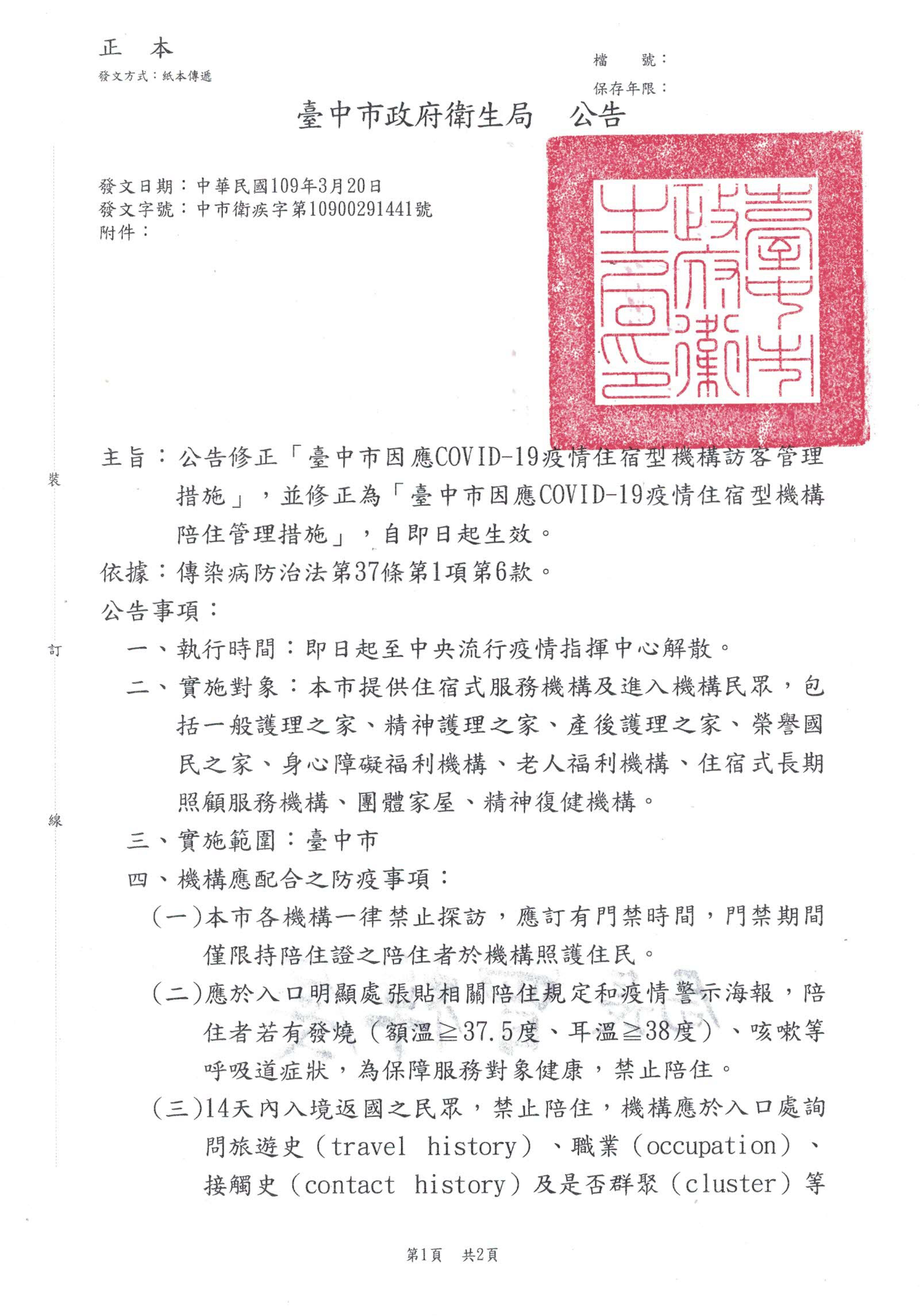 市府卫生局今日公告修正「台中市因应COVID-19疫情医院陪探病管理措施」及「台中市因应COVID-19疫情住宿型机构陪住管理措施」,医院及住宿型机构(如一般护理之家、精神护理之家、老人福利机构、身心障碍机构等)全面禁止探病,民众可多利用视讯或其他方式关心住院或机构内的亲友。