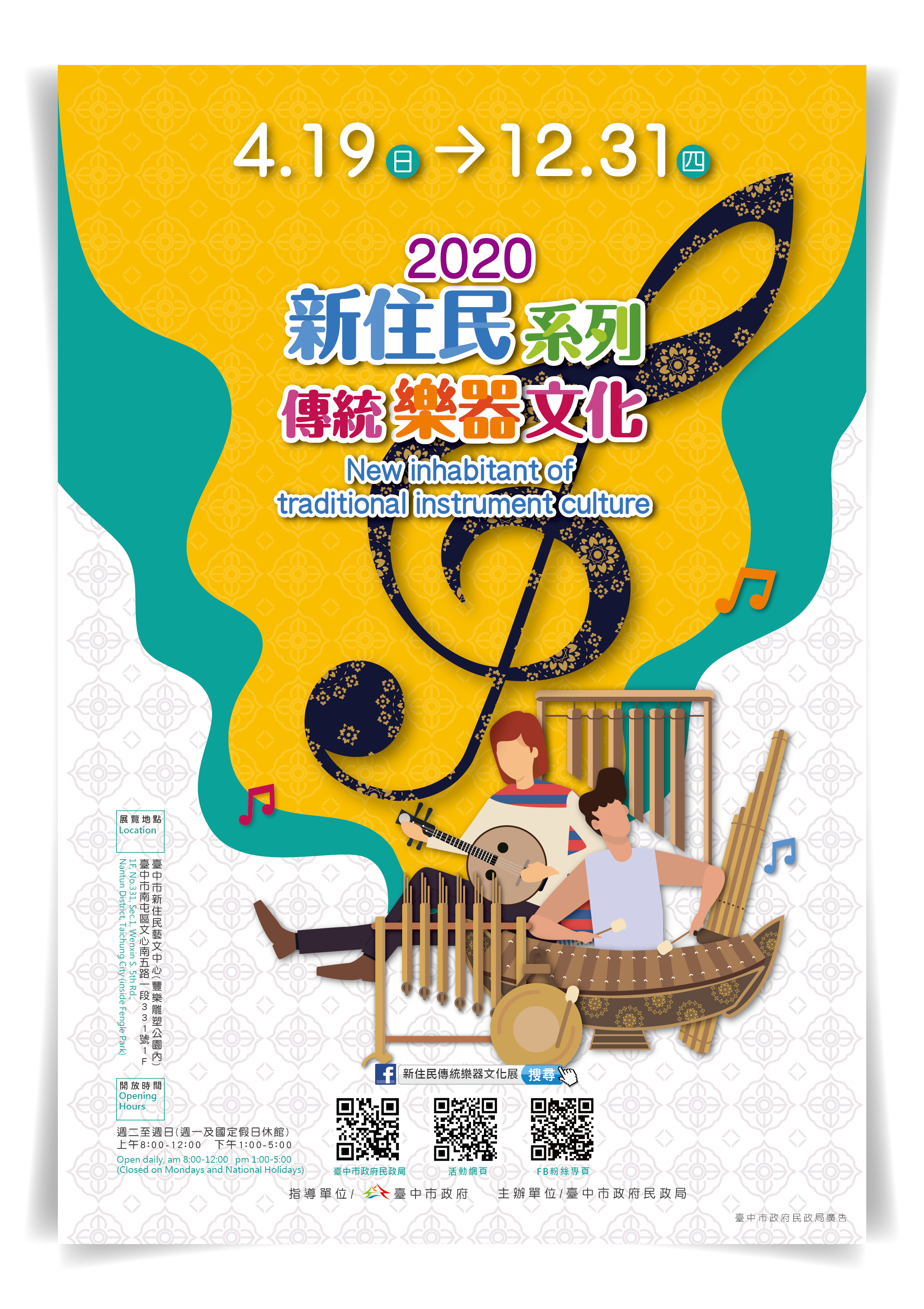 为传递多元文化之美,增进各民族情感交流与族群融合,自本(109)年4月19日起至12月31日於台中市新住民艺文中心(丰乐雕塑公园活动中心1楼)举办「新住民传统乐器文化展」,展期除静态展品及互动体验外,将陆续举办做作手艺 美食无国界课程、各国立体卷纸艺术课程、乐器DIY课程、中秋节活动及摸彩活动。