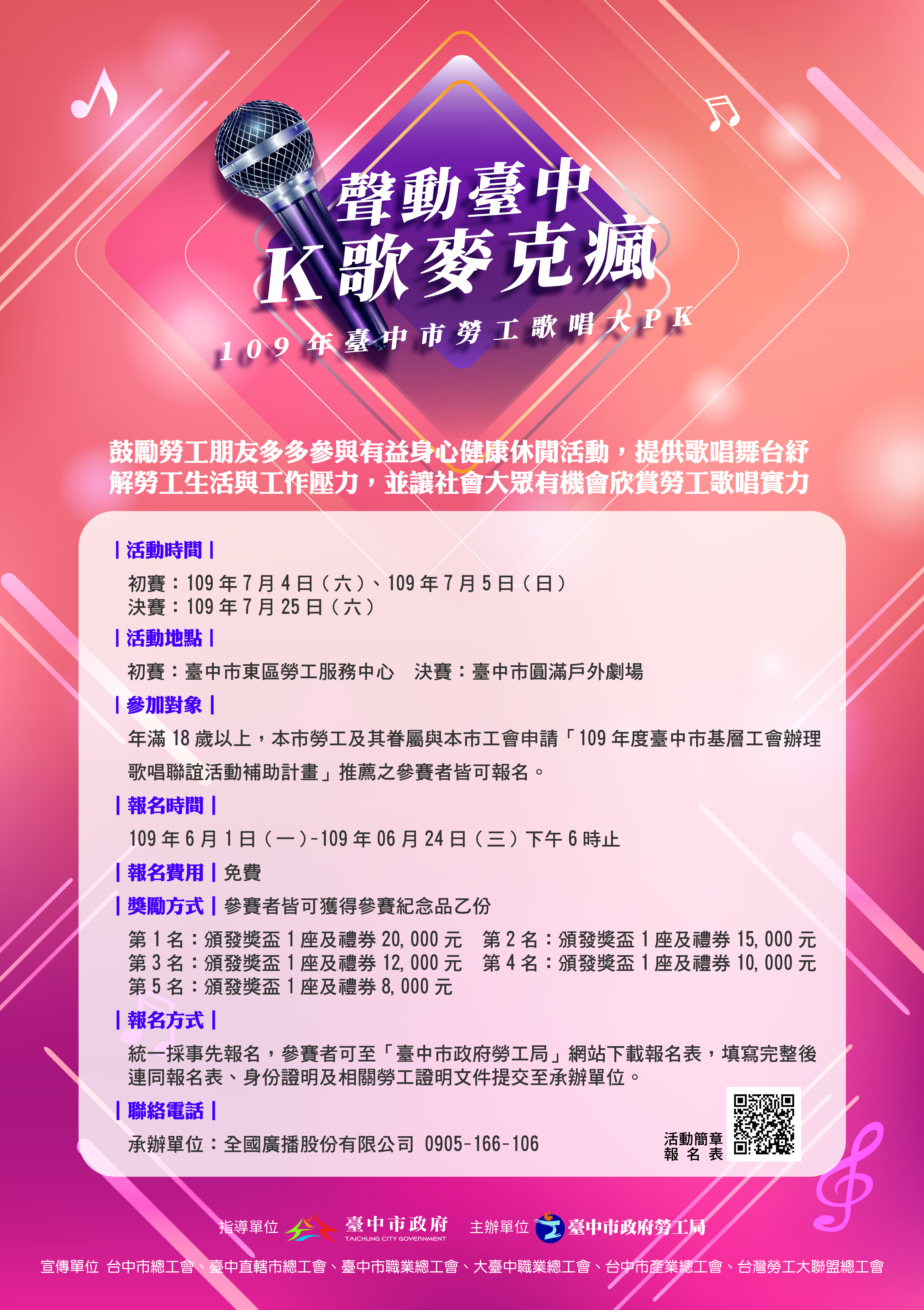 吴局长说明,凡年满18岁以上、工作地或设籍在台中市的劳工与其眷属,或由「109年度台中市基层工会办理歌唱联谊活动补助计画」推荐的参赛者皆可报名,报名期间自即日起至6月24日下午6时止。