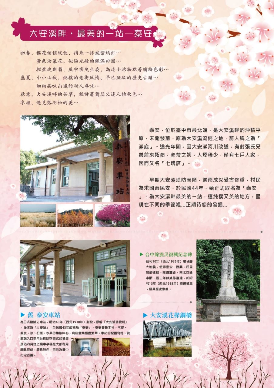 赖同一区长说,台中市近年最火红、最不一样的就是去派出所赏樱,泰安派出所位於泰安铁道文化园区,在前人慧眼独具的规划下,在泰安派出所及泰安国小临近大面积的种植樱花,栽植近百株的樱花树,有不同品种的八重樱及吉野樱,绽放不一样的樱姿美感,每年春节时分花开季节,樱红美景让人不忍离去,每天都吸引成千上万的民众前来赏樱,是爱花民众最期待的年度赏樱盛会。