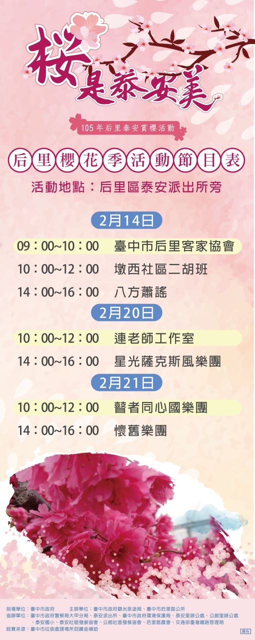 又是料峭春寒、百花绽放的季节,长达九天的春节假期何处去﹖到后里泰安派出所赏樱,绝对是今年春节假期最佳的选择,由台中市政府观光旅游局、后里区公所主办的「105年后里泰安赏樱活动」,2/8~2/21将在泰安派出所及泰安铁道文化园区隆重登场,后里区公所诚摰的邀请游客阖家春游到泰安,赏花踏春一举两得。