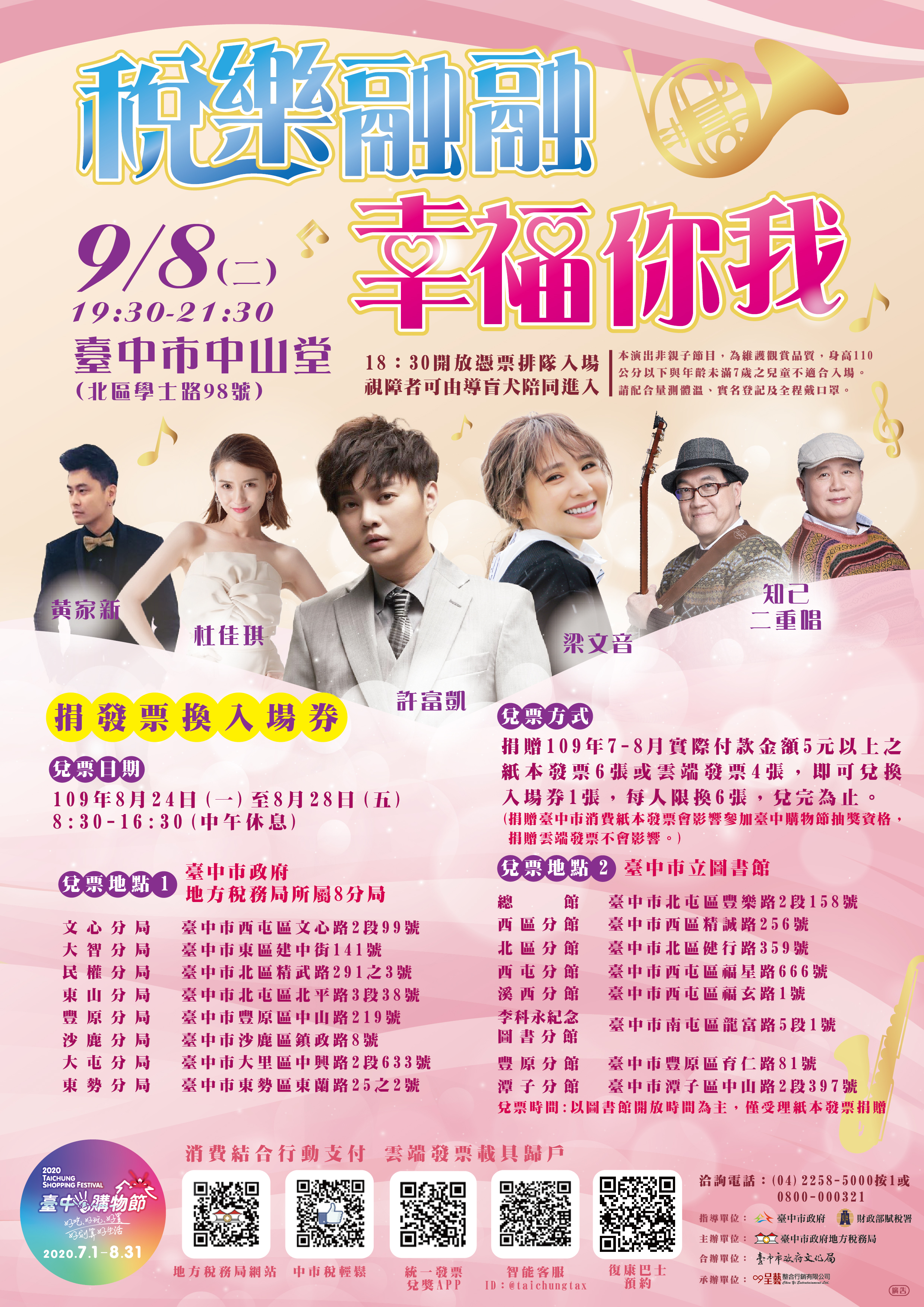 台中市政府地方税务局将於9月8日晚上7时30分在台中市中山堂举办 「税乐融融 幸福你我」演唱会,8月24日起开始以发票兑换入场券,募得发票全数捐赠给本市慈善单位。演唱当天将由实力派唱将许富凯、梁文音、黄家新、杜佳琪及知己二重唱同台浪漫开唱,和乐迷一同欢度美好夜晚。