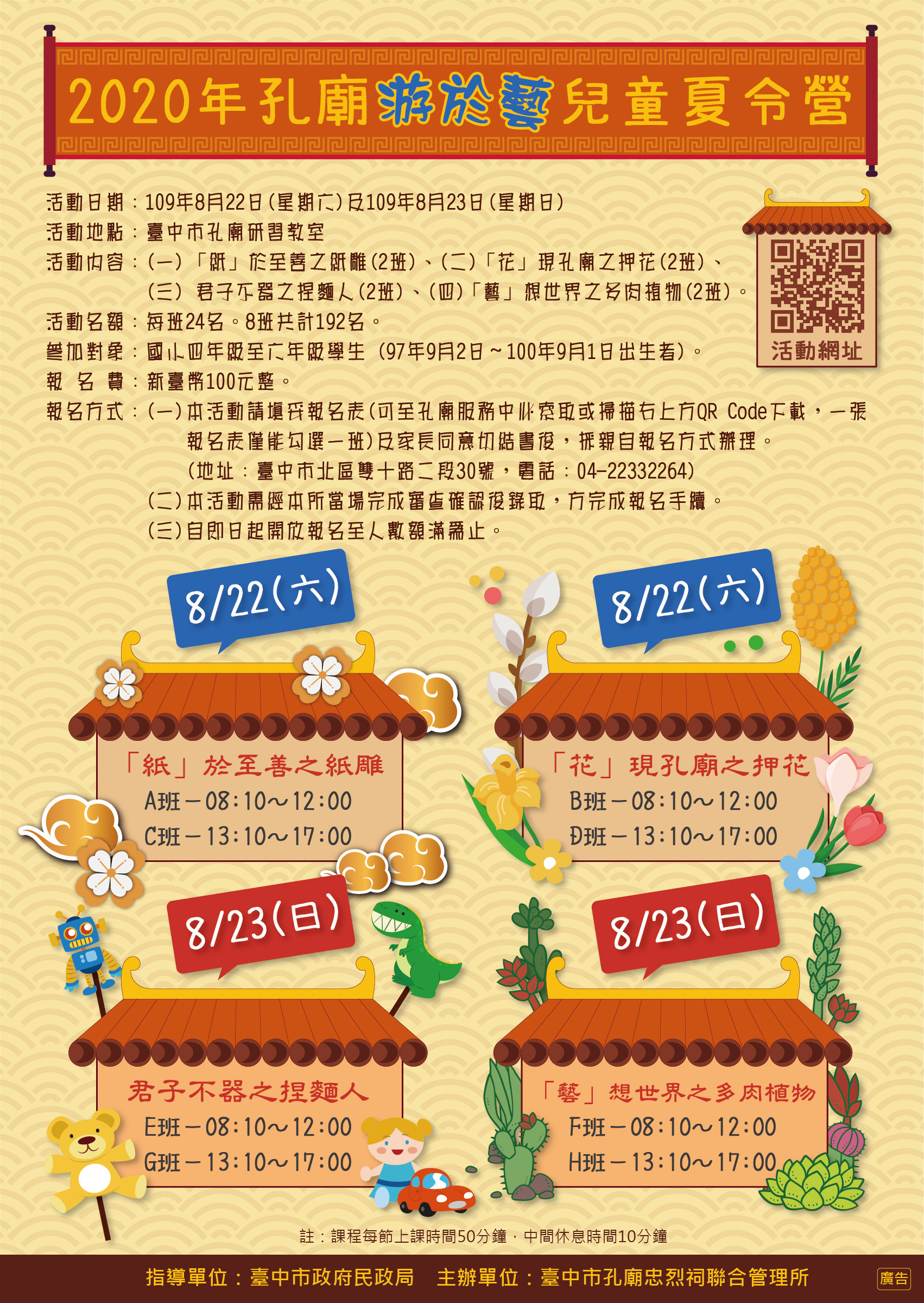 台中市孔庙为推广孔庙相关文化及现代六艺的学习,将於8月22至23日举办「2020年孔庙游於艺儿童夏令营」,盼透过互动式入门课程,让儿童循序渐进体验孔庙文化传承,活动尚有名额,欢迎民众踊跃帮家里的小朋友报名参与。