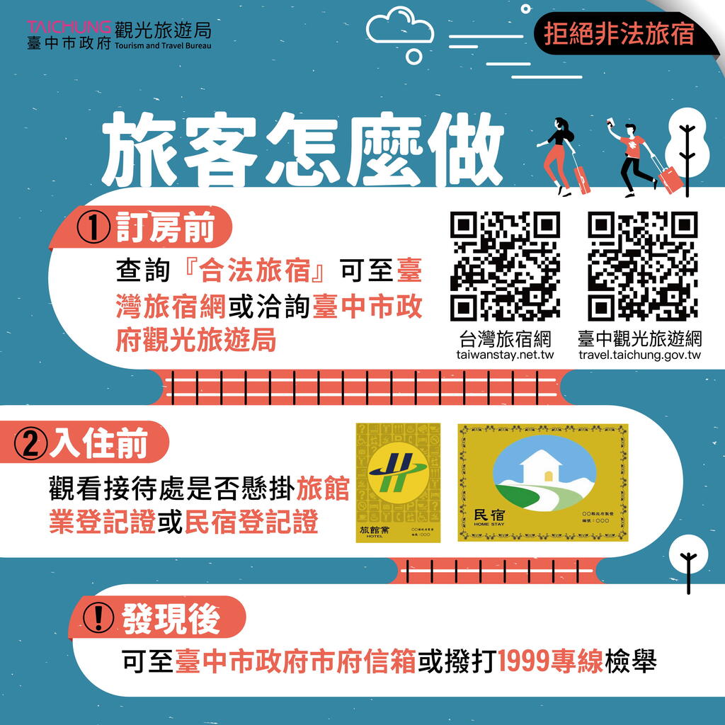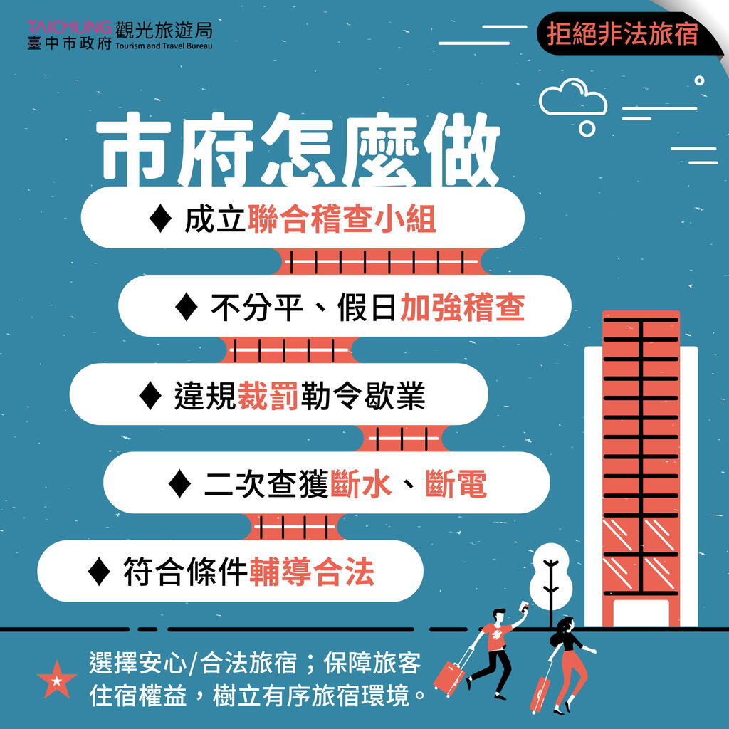 为保障住宿安全,防疫期间台中市旅宿防疫采分流管控,「安心旅宿」收住一般游客及居家检疫者家属,「居家检疫替代所」仅收住居家检疫者,并针对日租套房等非法旅宿加强查缉取缔,确保防疫工作无死角,保障旅宿公共安全,也特别呼吁所有旅客,一定要慎选合法旅宿入住,千万勿因价格低廉或交通便利,而入住日租套房等非法旅宿。