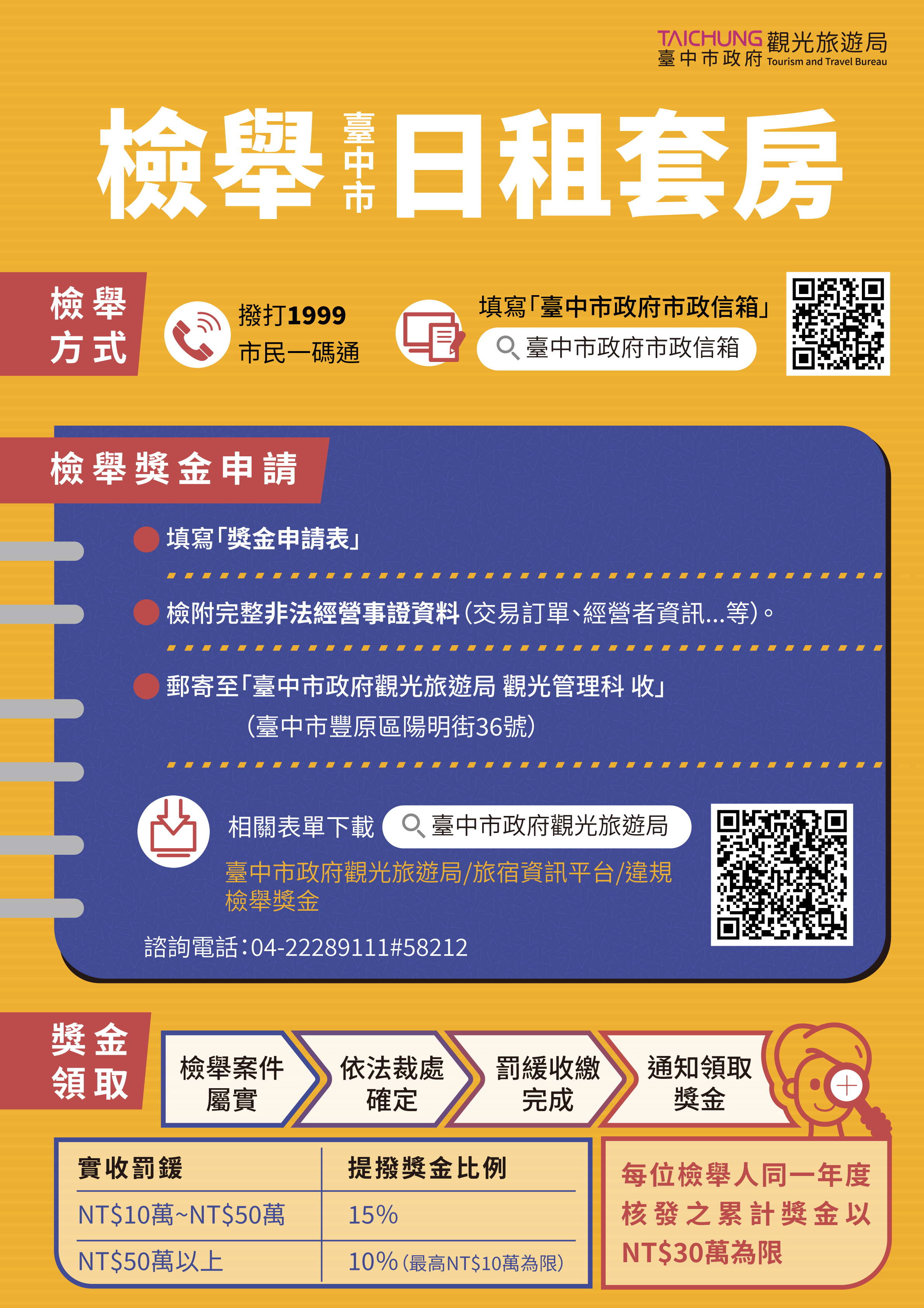 观旅局指出,防疫期间,查获5家日租套房提供居家检疫者入住,已依发展观光条例各裁处新台币10万元并勒令歇业,亦持续追踪,倘同一地点被查获裁处第二次,最严重将强制执行断水电处分,呼吁民众千万不要以身试法。另民众如发现有经营日租套房或非法旅宿场所,可提出书面检举,检附明确的经营地点及交易明细等事证,经查证属实,裁罚金额新台币10万元以上者,经营业者完成缴纳罚款後,将提拨实收罚款金额的10%至15%作为检举奖金。