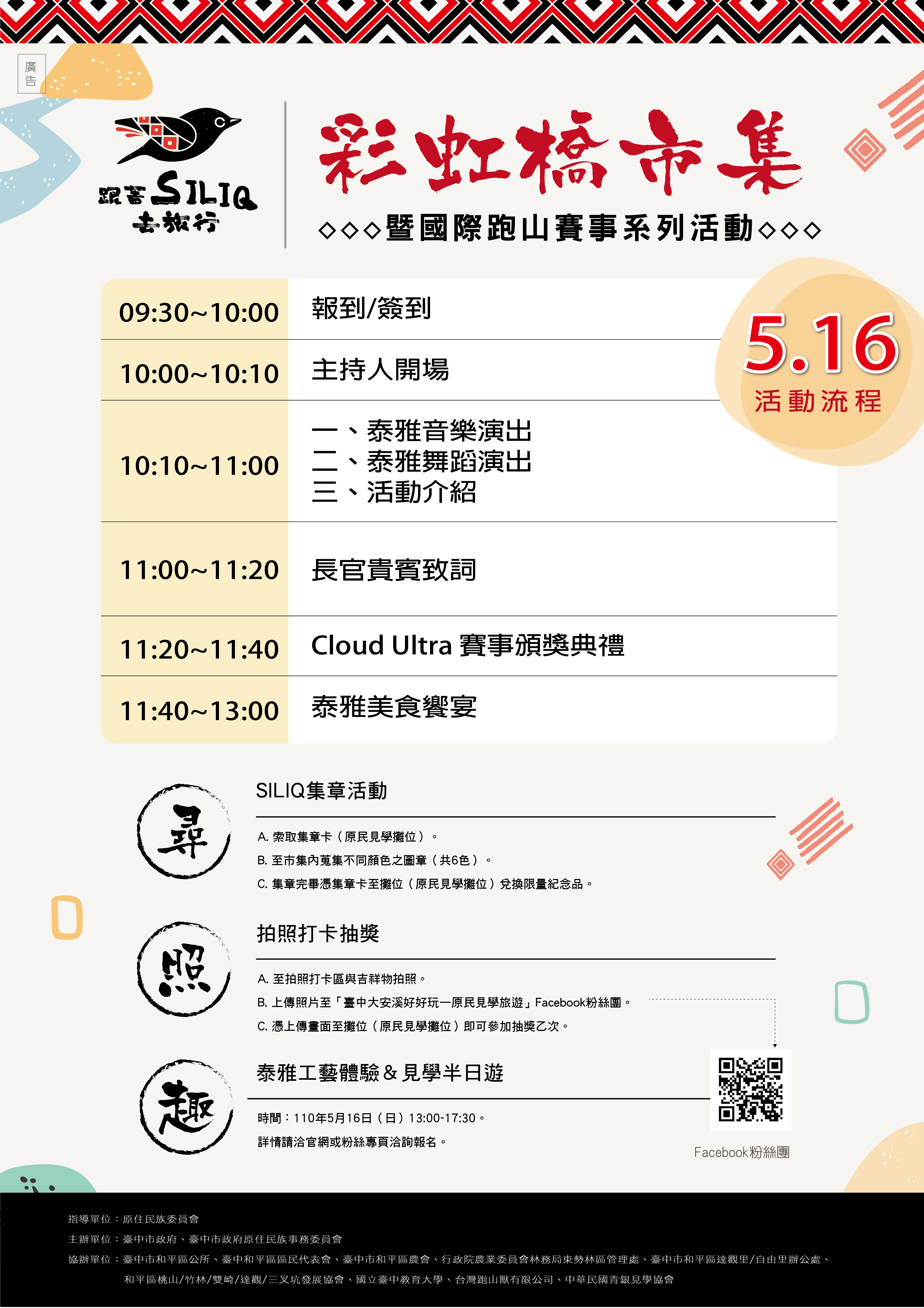 本年度第一场原民见学部落彩虹桥市集,以「聚集msli’」为主题传递跨族群的聚集与交流,聚在一起来认识大安溪,聚在一起跑山看见山林之美与聚在一起吃吃喝喝分享日常生活,本次活动与台湾跑山兽团队跨领合作,透过专业的国际跑山运动,邀请世界选手前来部落体验,透过跑山活动认识美丽的山林,赛事之余体验原乡部落生活,本活动资讯: