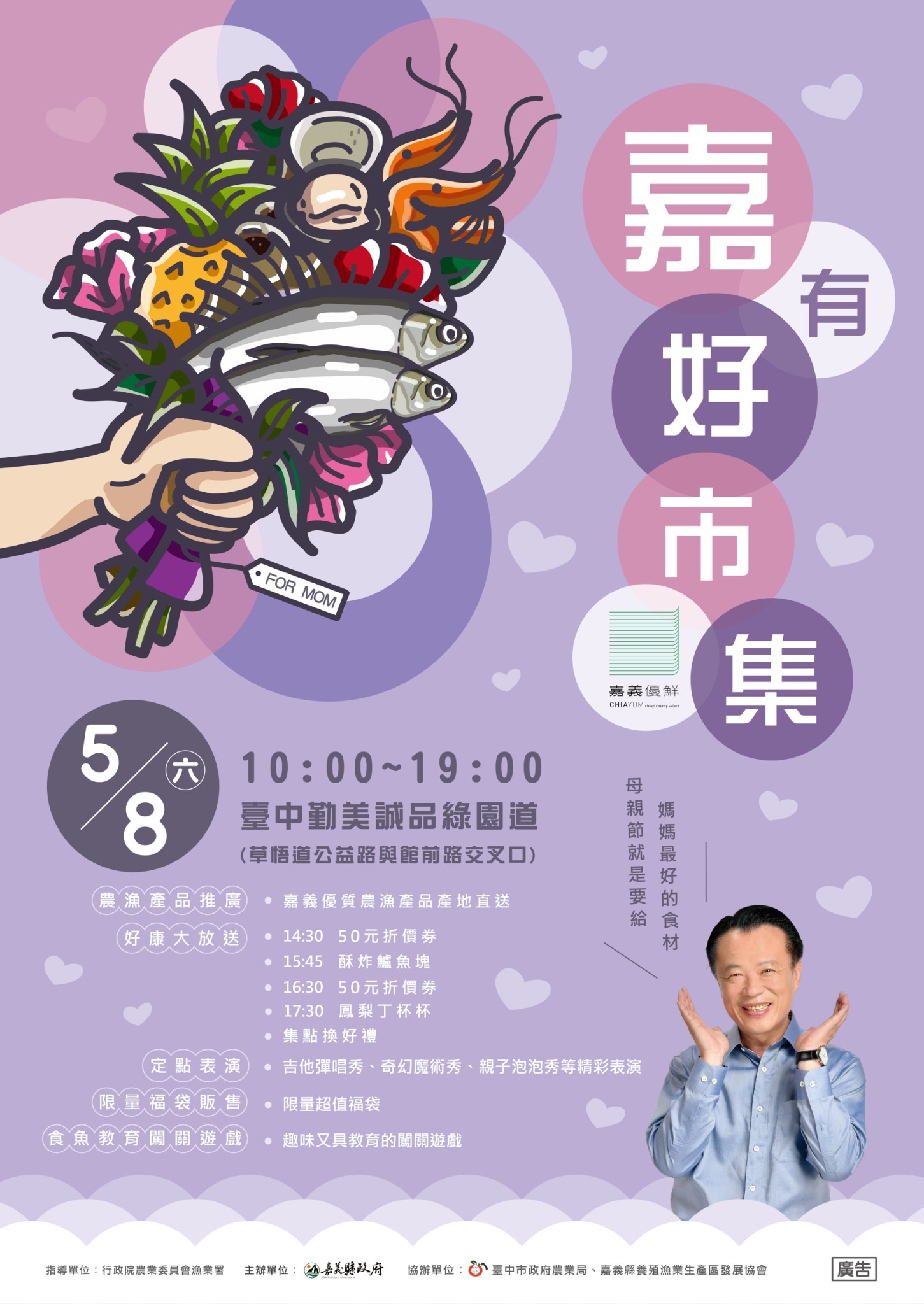 行销国产优质农渔产品,台中市政府三度携手嘉义县政府,於母亲节前夕5月8日在草悟道举办「2021嘉有好市集─台中站-优质农渔产品行销推广活动」,产品有严选的台中蜂蜜、嘉义凤梨、鲈鱼、乌鱼子等农渔特产,还结合闯关游戏、满额赠好礼、渔产福袋特卖等系列活动,好买、好吃又好玩,欢迎民众踊跃参加。