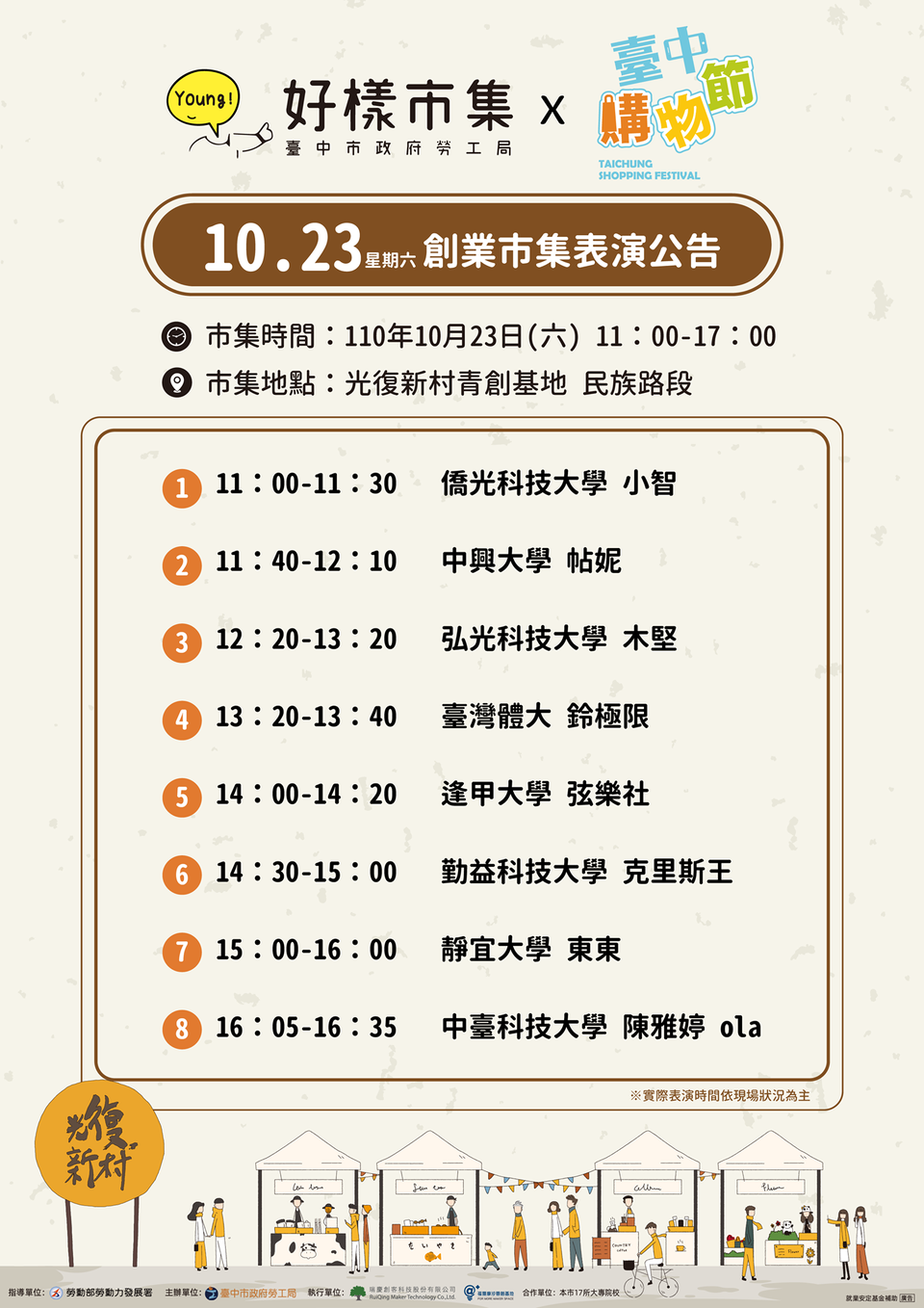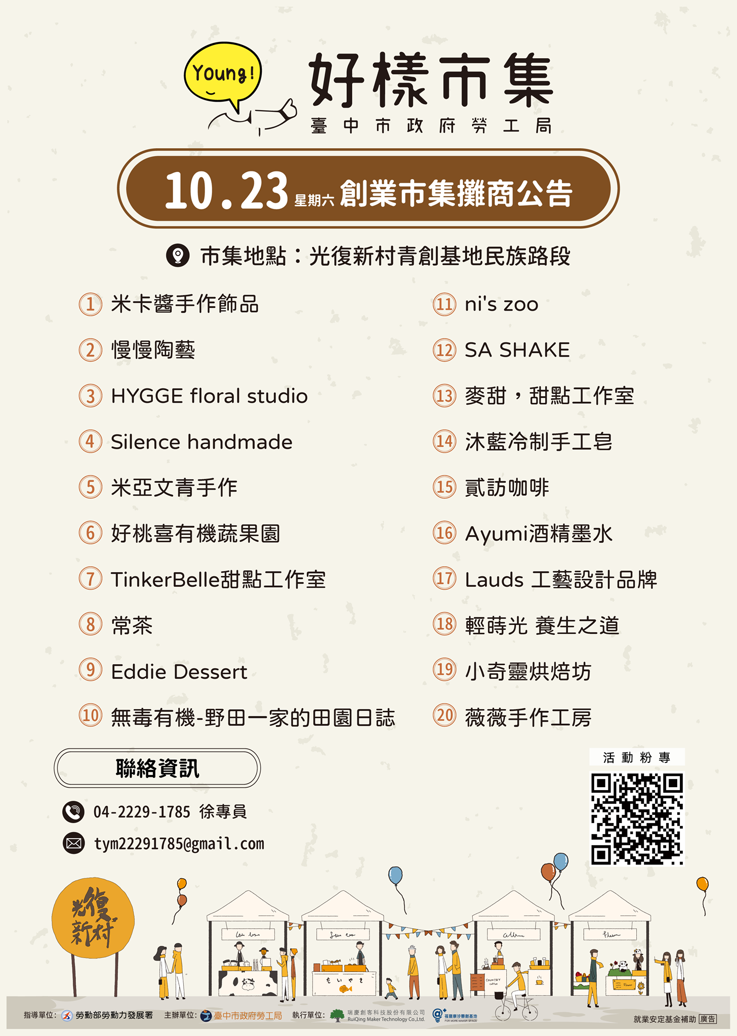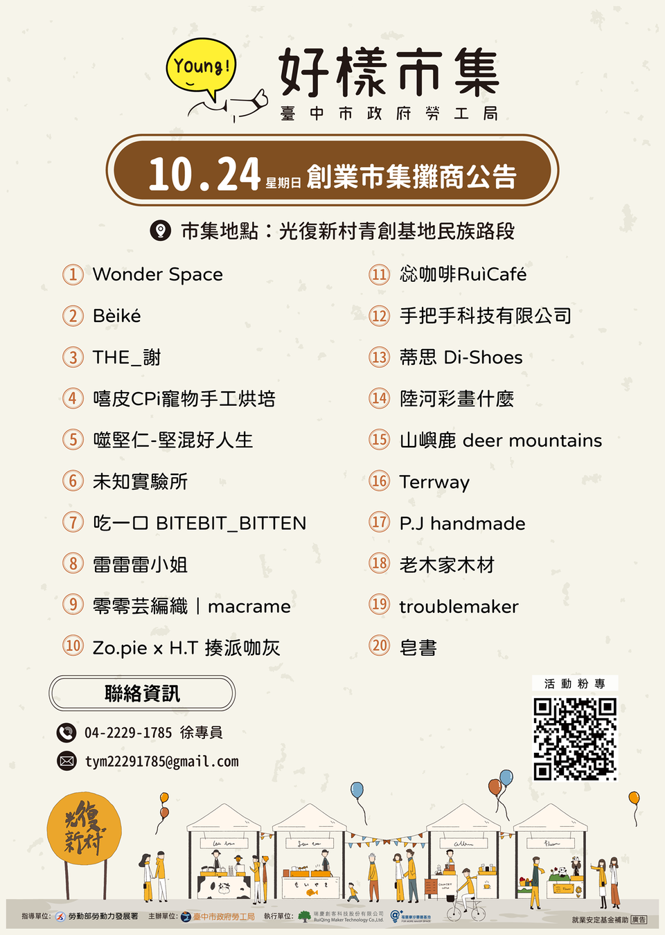 用心协助青年创业,台中市政府劳工局与台中各大学持续合作推动青年创业圆梦,於10月23、24日11时至下午5时在光复新村青创基地,举办今年第15、16场「Young!好样市集」,由20组学生或创业青年团队共同设摊,活动更结合台中购物节一起拚经济,民众到场购物可於台中购物节APP登录发票,累积满500元即可参加抽奖,欢迎踊跃参与。