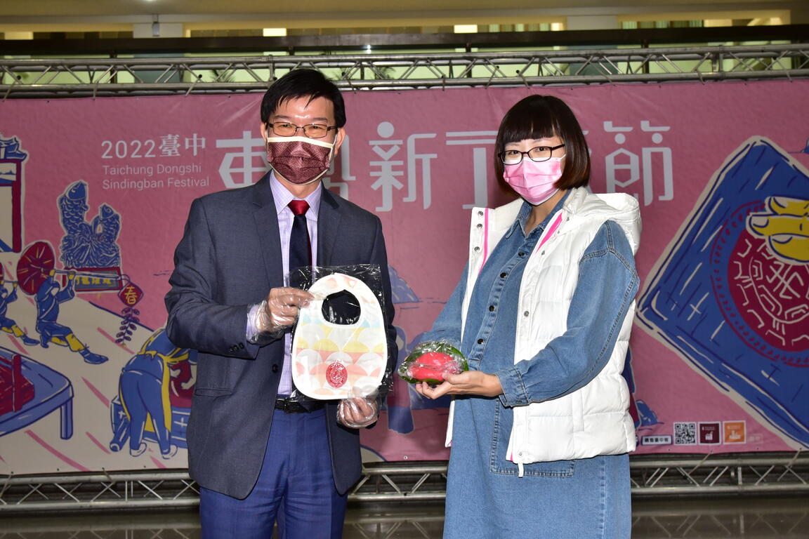 「2022台中东势新丁粄节」记者会今(22)日上午热闹举行,由台中市政府客委会主委江俊龙代表市长卢秀燕出席,宣告活动将於2月15日盛大登场。今日现场邀请台中一中学生分别以客语及英语介绍关於新丁粄节的故事。此外,现场来宾也一起切开120斤大粄,DIY手作新丁粄,江主委并将亲手制作的新丁粄及绣有新丁粄图样的婴儿用口水巾,赠送给已有身孕的教育局同仁戴小姐,献上祝福。