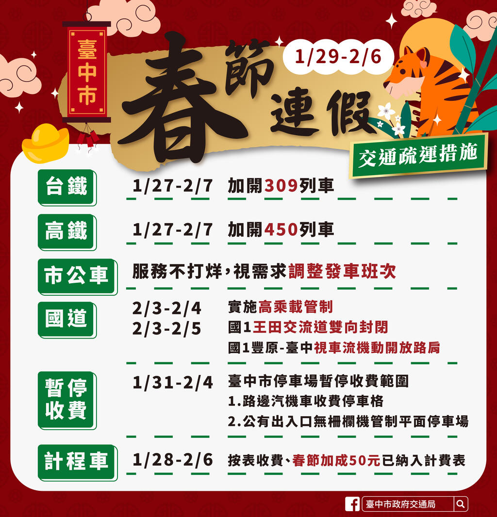 农历春节连假来临,台中市政府交通局推出交通疏运计画,春节期间市区公车服务不间断,并针对大甲镇澜宫等观光景点及百货商圈实施交通管制;计程车费率於1月28日至2月6日依计费表显示金额收费(春节加成50元已计入)。