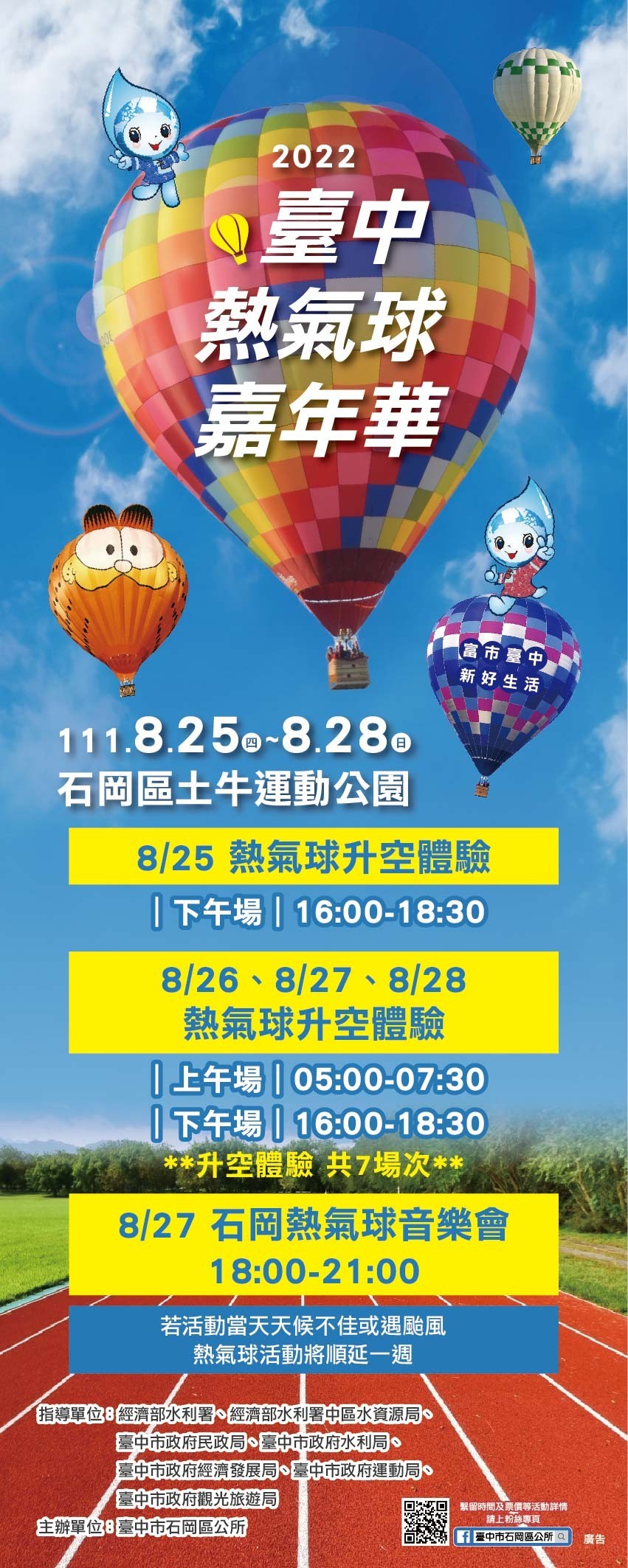 睽违已久的第二届台中山城热气球嘉年华,将於8月25日至8月28日在石冈区土牛运动公园登场。台中市政府民政局表示,此次活动规划7场热气球系留升空体验,现场排队购票,每张票均一价500元,活动开始前半小时开始售票,限量150张;此外,还有音乐晚会、华丽烟火及光雕喷火秀,欢迎民众到石冈体验,鸟瞰山城美景。