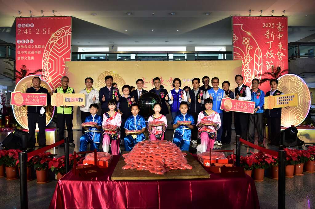江主委代表市长卢秀燕出席时表示,「2023台中东势新丁粄节」入选为中央客家委员会112年全国「客庄大节」之一,为让活动更具文化底蕴及节庆价值,不仅保留传统原汁原味的鬪粄比赛,也为民众进行具有特殊文化意义的求子仪式,更延续去年广受好评的公益贩卖,将「新丁粄【𣛮】(changˋ)木提礼盒」与《掌声想起 凤飞飞》纪念专书赠予社福团体义卖,并於2月5日规划捐血活动,欢迎民众为社会注入「新血」,让新丁粄节不但具备保存文化、提倡性平、鼓励生育等教育寓意,更彰显活动的社会价值,持续打造台中客家节庆品牌。