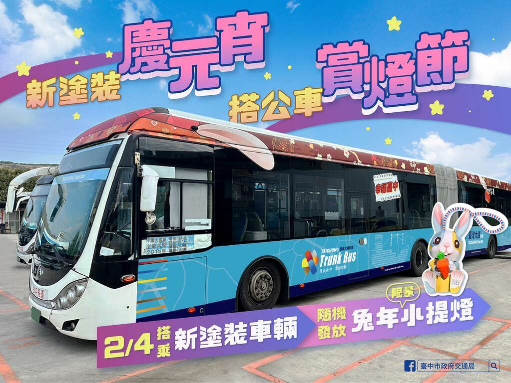 跟着福兔搭公车,幸运民众还能拿到小提灯!台中市政府交通局营造「钱兔似锦」节庆氛围,全国首创双节公车兔年彩绘,并宣传2023中台湾元宵灯会,为吸引大家搭乘公车前往现场,明(4)日将随机发放兔年小提灯给搭乘兔年彩绘公车的民众,中央公园灯区会场也会发送小提灯,欢迎领取。