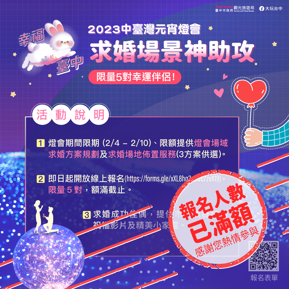 台中市政府日前加码推出《2023中台湾元宵灯会限定-求婚场景神助攻》活动,限额提供灯会现场浪漫求婚场景营造服务,经网路报名,已有超过5对佳偶踊跃报名,市府观旅局感谢市民朋友青睐灯会场地,并已陆续与报名民众接洽,规划灯会现场求婚方案、灯会场域求婚场地布置服务等,求婚成功者将获得市长亲录结婚祝福影片及精美小家电,祝福圆满成家。