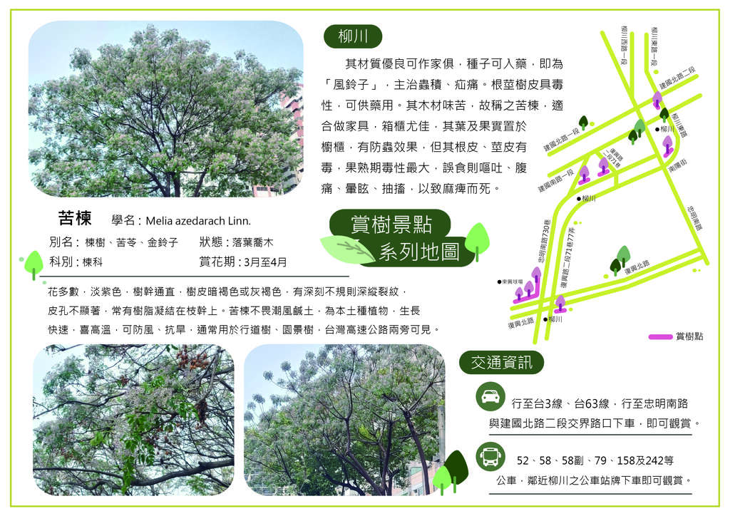 建设局提醒,楝树的赏花期约为10天左右,通常在清明节前後,近期正是最佳赏花时机。楝树是台湾原生种之一,也是台中市常见的行道树与公园观赏乔木,3月至4月春夏交替的时间为开花之际,欢迎民众驻足欣赏楝树开花的美景。
