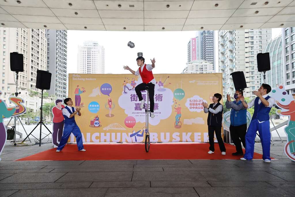 文化局今日於台湾大道市政大楼举办活动宣传记者会,现场由河堤乐团、萝丝小姐及优尼客当代马戏团带来精彩演出,并有多组视觉艺术及创意工艺类静态街艺展示手作艺品,展现台中街头艺术的丰富多样性。陈局长指出,街头艺术汇演已率先於5月13、14日在绿空铁道、清水眷村文化园区登场,紧接着重头戏「2023台中街头艺术嘉年华」将於5月20、21日在中央公园热闹举行。