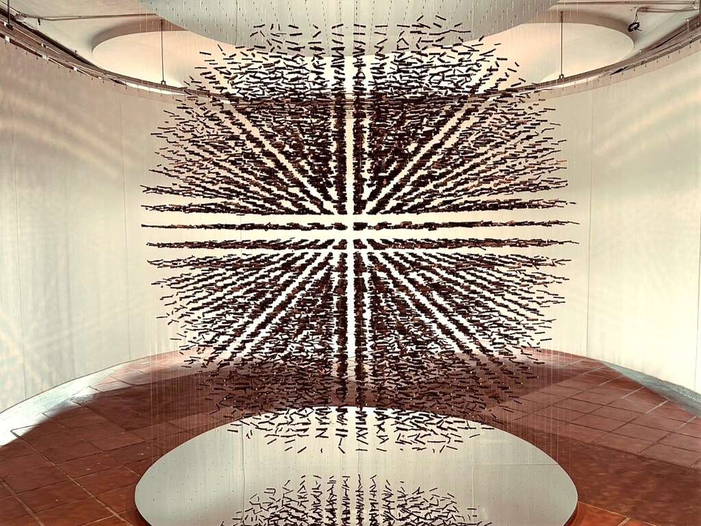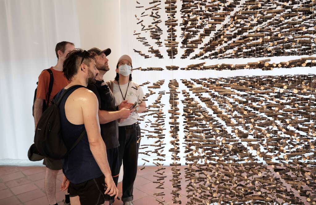 打卡新热点!浪漫台三线艺术季在各地透过多元方式推广文化探索活动,台中东势客家文化园区正展出艺术家徐景亭的「野生产销班」作品,「野生产销班」为徐景亭捡拾农民为让梨子长得更大更好而定期修剪的徒长枝(东势着名的嫁接梨枝),透过数位标编号与计算,以垂吊的方式排列创作的大型艺术作品,吸引国内外游客前来拍照打卡,成为东势客家文化园区新亮点。