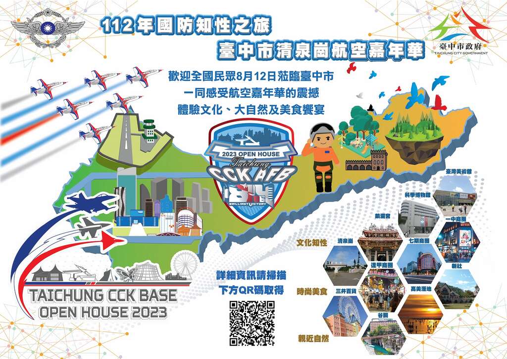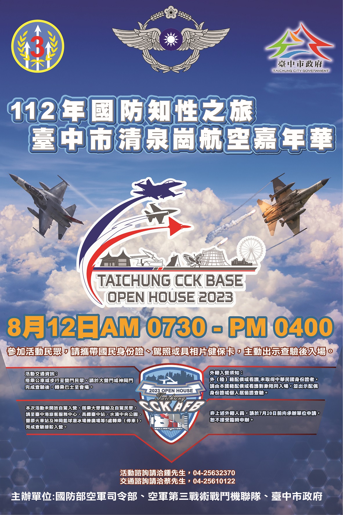 民政局说明,此次活动由空军第三战术战斗机联队与台中市政府合作举办,活动当日上午7时30分开放进场、9时表演正式登场,由5架IDF型战机带来开幕冲场,另2000-5型、F-16V型战机及勇鹰新式高教机,也将进行一连串空中展演,空军战机精锐尽出,大展震撼英姿。