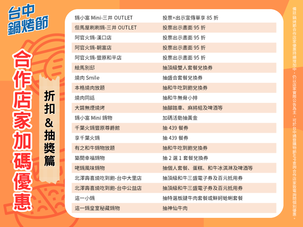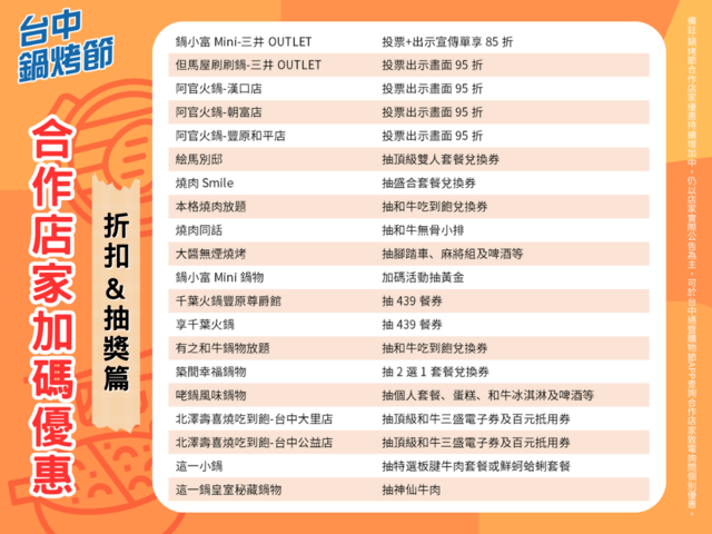 此外,投票折扣优惠包含锅小富三井OUTLET店,凡投票并出示官方指定贴文享85折;但马屋三井OUTLET店、阿官火锅的汉口、朝富及丰原和平店都能凭投票画面打95折;部分业者则发起粉丝团活动,如有之和牛锅物放题抽和牛吃到饱餐券、这一锅皇室秘藏锅物抽神仙牛肉、北泽寿喜烧大里及公益店抽顶级和牛三盛电子券、百元抵用券;另筑间集团则大打「团体战」,集合旗下幸福锅物、烧肉smile、絵马别邸、本格烧肉共推投票抽套餐兑换券,盼在票选活动挥出「全垒打」。