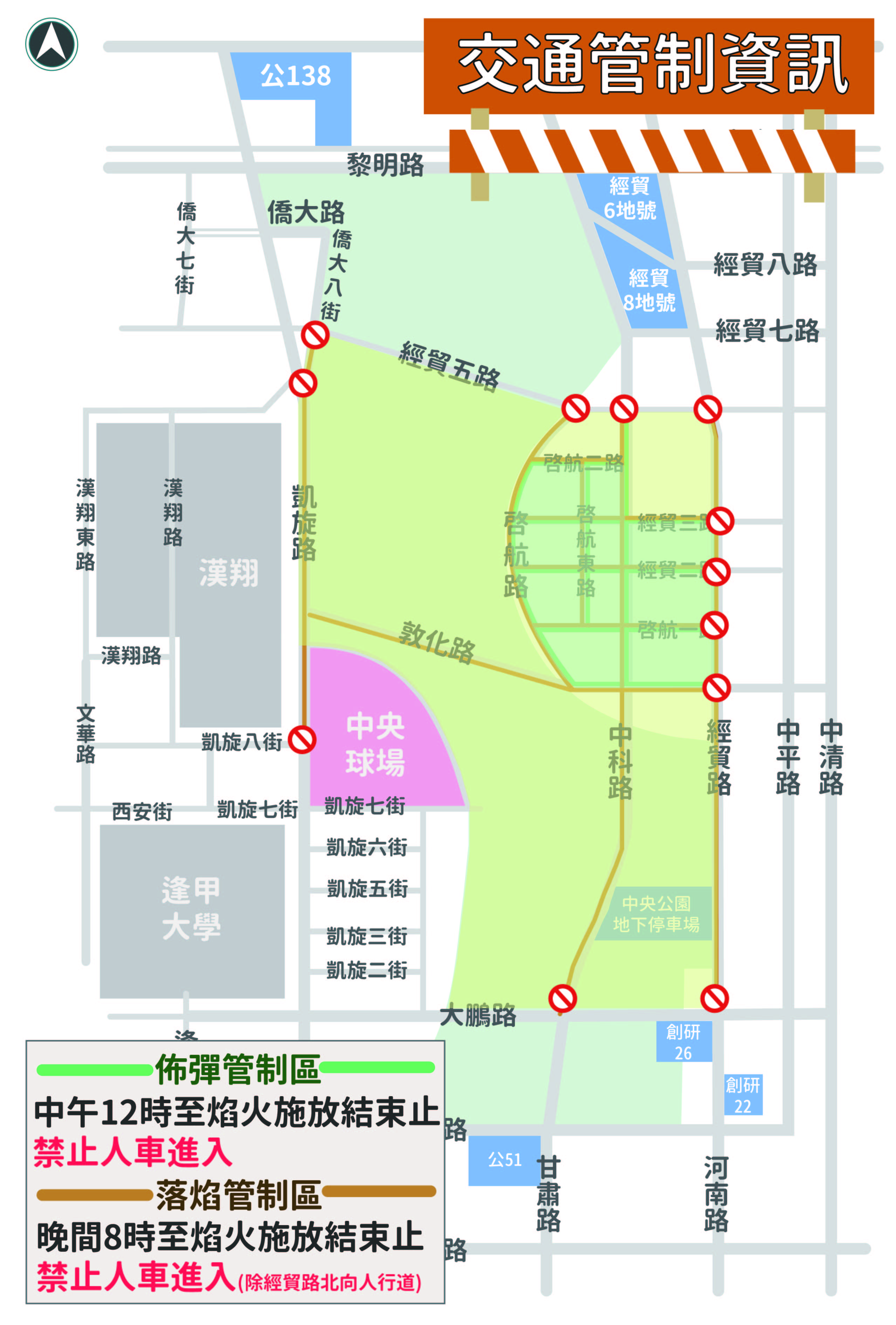 另「施放(落焰)管制区」则於焰火施放前後进行管制,自晚间8时起至焰火施放结束止,管制路段包含中科路(经贸五路至大鹏路)、凯旋路(侨大八街至凯旋八街)及敦化路(凯旋路至经贸路一段)等,管制期间人车均禁止进入,请用路人遵循现场交管人员指挥,配合改道。