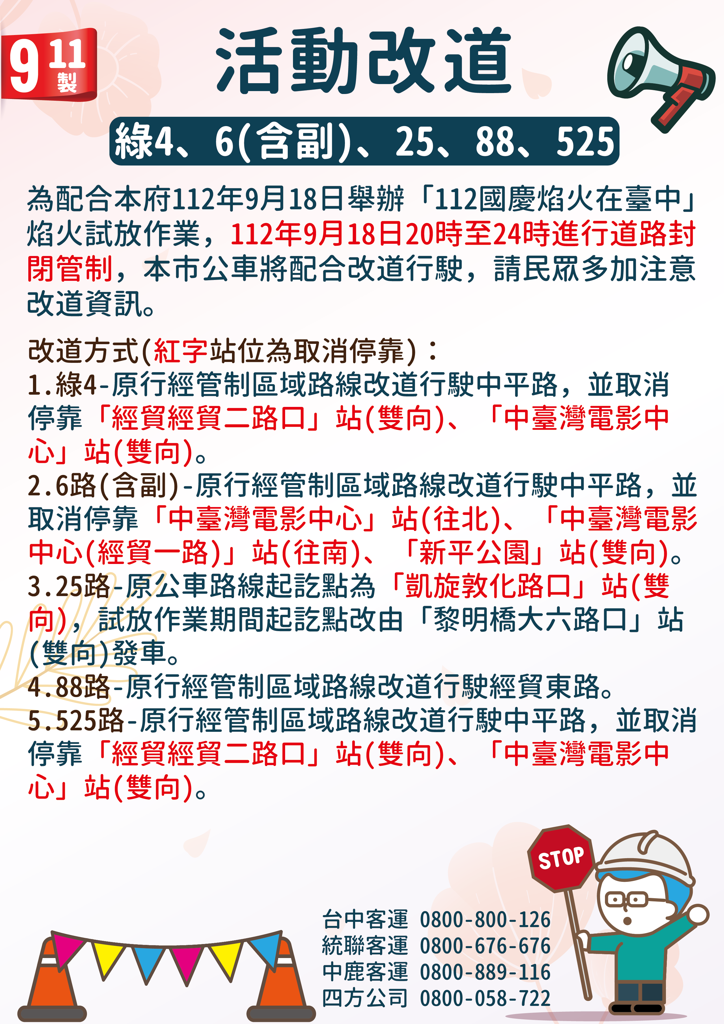 交通局提醒,配合国庆焰火试放,部分公车及iBike站点将进行管制,其中市公车路线6、6副、25、88、525、绿4配合交通管制路段将进行改道,详情可至台中市公车动态资讯网页 及台中公车APP ( https://citybus.taichung.gov.tw/ )查询;另iBike站点除「经贸五侨大八街口站」、「触觉体验区(经贸五路)站」、「自我体验区(侨大八街)站」、「敦化凯旋路口站」、「中央公园(游客服务中心)站」5站暂停营运外,其余站点维持正常营运,相关资讯可至微笑单车官方网站 ( https://www.youbike.com.tw/region/i/ )查询。