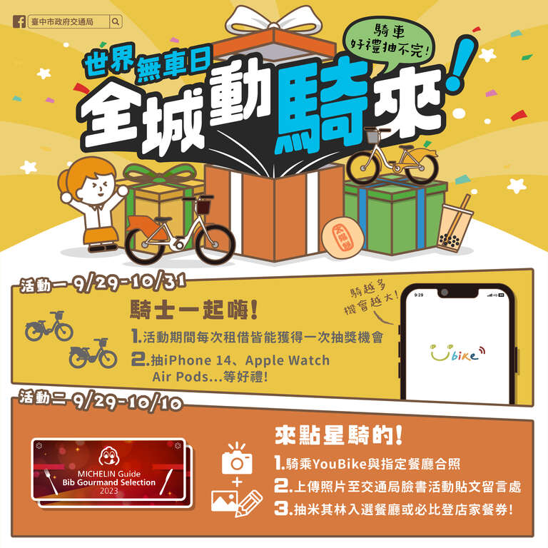 响应9月22日世界无车日,台中市政府交通局自9月29日至10月31日将举办「全城动骑来」活动,鼓励大家骑乘iBike,活动期间每租借一次就有一次抽奖机会,奖项包含iPhone 14、Apple Watch及Airpods 3等,或与指定米其林餐厅合照上传到交通局脸书粉丝专页,即可参加优惠礼券抽奖,欢迎全国各地民众一「骑」来台中!