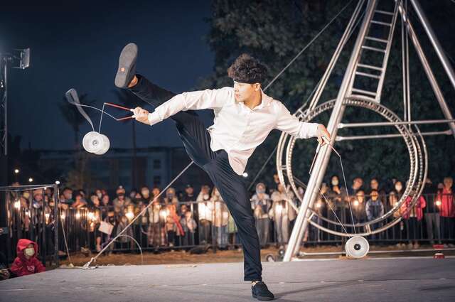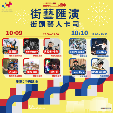 文化局长陈佳君表示,迎接国庆焰火重返台中,特别邀集全台街艺好手,带来有别於主舞台区的互动式体验节目,横跨扯铃、默剧、杂耍及特技,带领现场观众沉浸在街头艺术的欢乐世界。10月9日暖身活动有郑涌苍带来冠军级扯铃表演及Mimofatguy的默剧互动秀;10月10日璀璨国庆焰火之夜,邀请有街头小太阳之称的周子益带来魔术杂耍互动秀,以及来自马来西亚的方庭良带来国际级扯铃秀,精彩可期。