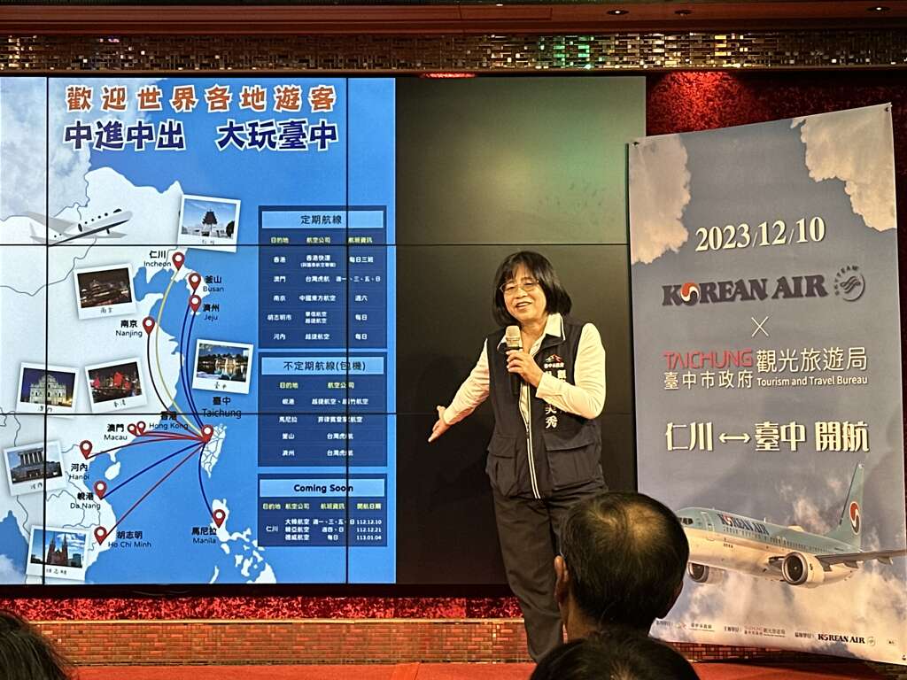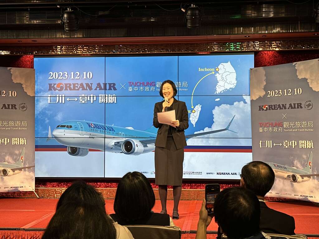 台中的天空越来越热闹了!大家期待已久的「仁川-台中」航线即将开航,今(20)日台中市政府观光旅游局长陈美秀、大韩航空台北分公司总经理徐旼廷,及交通部民用航空局台中航空站主任张瑞澍,一同在台湾大道市政大楼召开开航记者会,宣布将於12月10日迎来大韩航空「仁川台中」航线的韩国观光客。