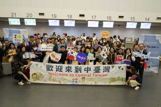 台中市政府携手中台湾7县市昨(10)日於台中国际机场欢喜迎大韩航空首航「仁川-台中」航线旅客,由市府观光旅游局长陈美秀和7县市代表,与大韩航空大中华地区本部长朴耀翰、大中华地区本部客运部总经理林永炖及交通部民用航空局台中航空站主任张瑞澍共同欢迎韩国旅客,致赠迎宾礼包,让旅客入境後马上感受到台湾的热情好客。