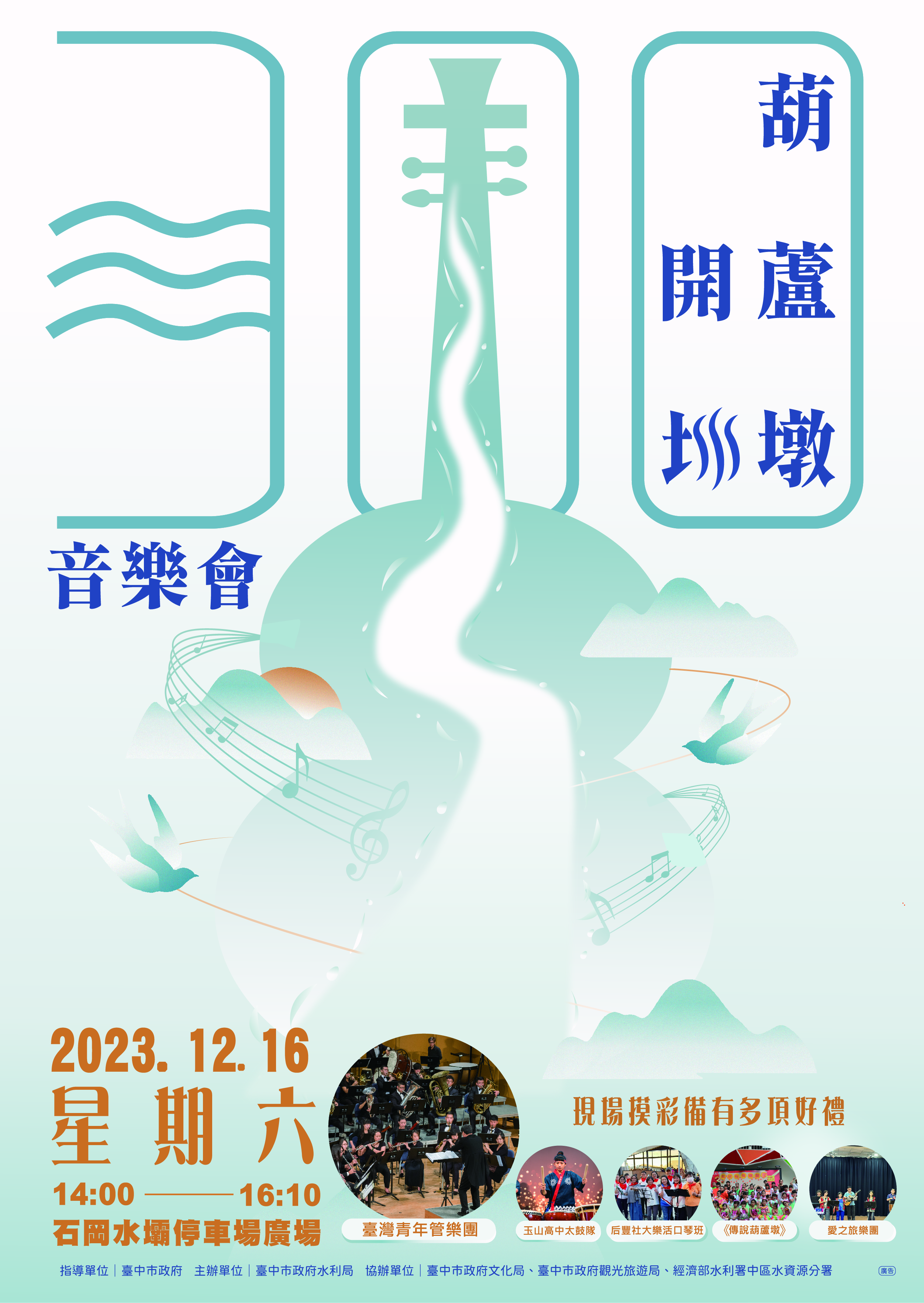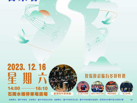 台中市政府水利局为纪念葫芦墩圳开圳300年,将於12月16日14时至16时10分,在石冈水坝停车场广场举办「葫芦墩开圳300音乐会」,活动将邀请荣获台中市杰出演艺团队的台湾青年管乐团及许多杰出表演团体担纲演出,现场还有特色市集、木艺DIY体验、互动彩绘墙以及摸彩活动等丰富内容,诚挚邀请市民朋友一起来欣赏悠扬乐声。