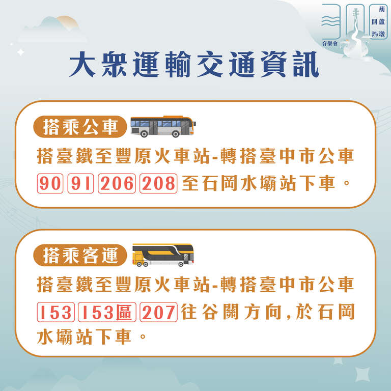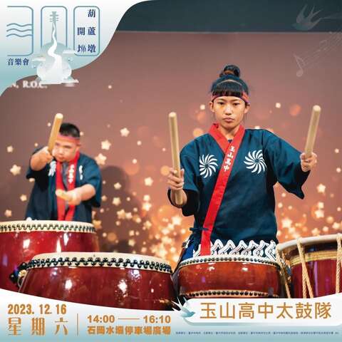水利局表示,音乐会活动当天将特别邀请台湾青年管乐团与指挥家姚政龙、声乐家张家煌共同演出,带来《烧肉粽》、《我的未来不是梦》等经典曲目致敬大甲溪流域孕育出的杰出人才,同时还有斩获今年全国冠军的玉山高中太鼓队、后丰社大乐活口琴班、丰原在地学生创作《传说葫芦墩》,以及爱之旅乐团《葫芦墩诗响曲》等精彩内容,一同唱出葫芦墩圳的地方人文特色。