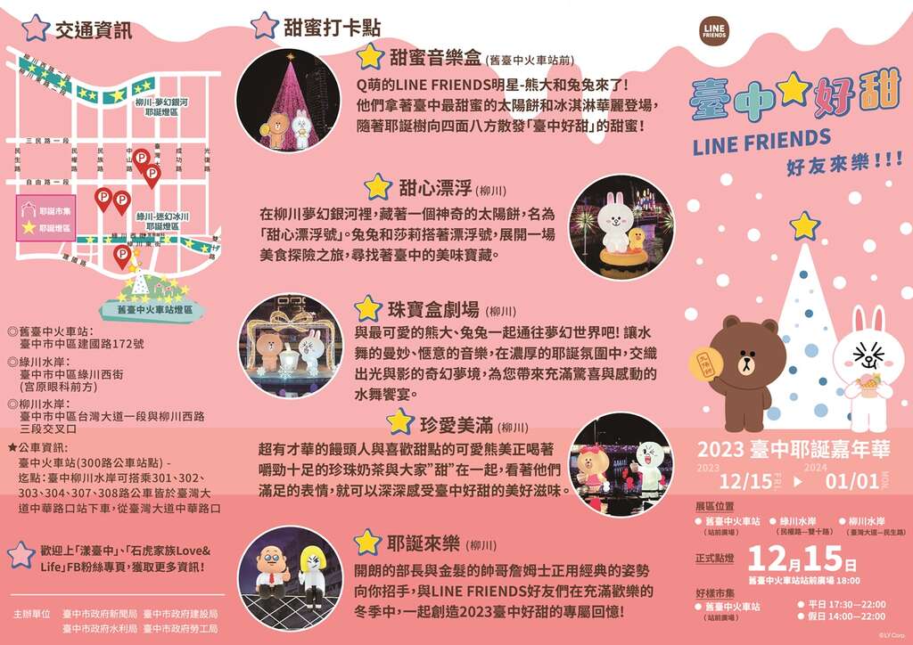 新闻局说明,今年2023台中耶诞嘉年华「台中好甜,LINE FRIENDS好友来乐!」大升级,除邀请全球人气明星LINE FRIENDS来到台中,更扩大展区,新增旧台中火车站前中山路段,打造站前广场往来绿川的迎宾路廊;此外,也将绿川布置从去年民权路至成功路,再延伸到双十路,将展区连结到东区商场,希望让民众散步慢慢浏览绿川之美。