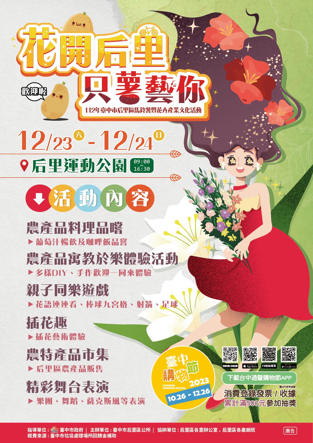 台中市后里区公所订於112年12月23、24日,假后里运动公园举办「112年台中市后里区马铃薯暨花卉产业文化活动-花开后里 只薯艺你」。