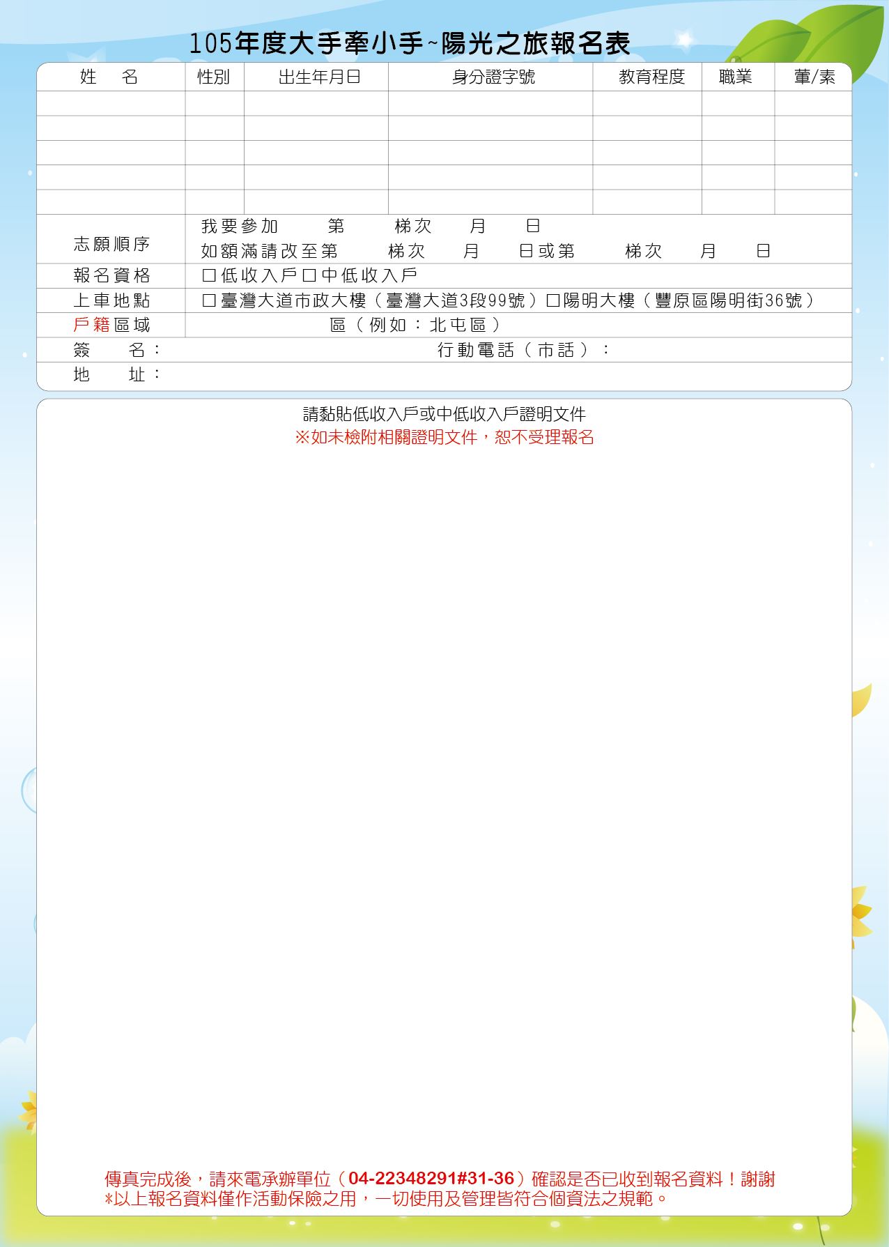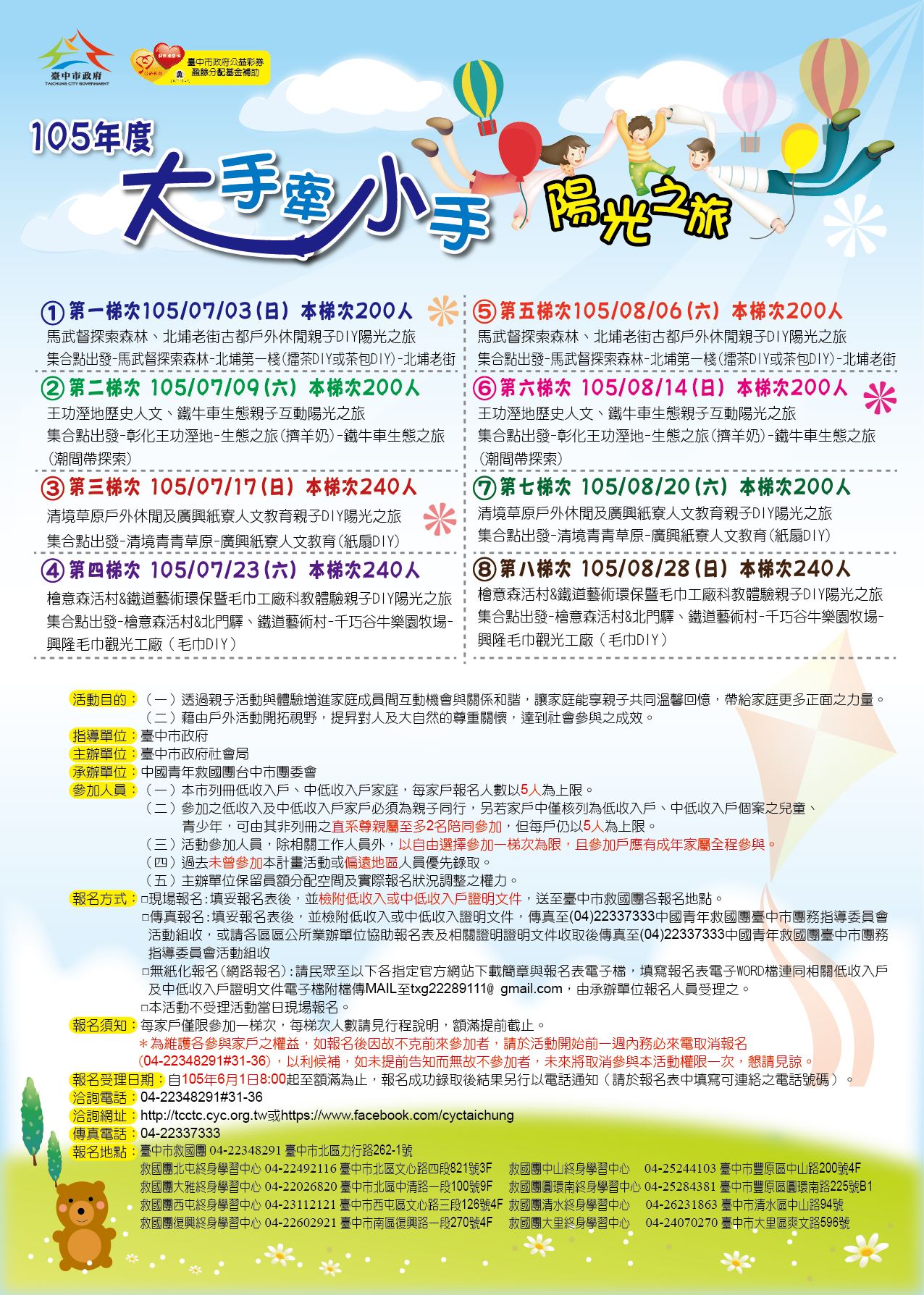 『105年度大手牵小手阳光之旅』活动自105年6月1日起开始报名,欢迎踊跃参加。