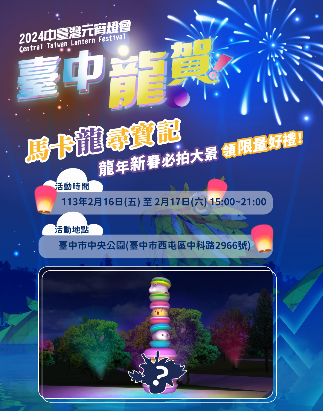 中台湾元宵灯会今(16)晚将於中央公园盛大登场!台中市政府观光旅游局表示,此次除了水上巨龙主灯倍受关注外,今明两日还有限定活动,民众只要在「谁在呼拢」灯区与最爱的灯组合影拍照,并於观旅局官方脸书「大玩台中」活动贴文留言、标注两位好友和上传照片,即可到小提灯发放处「闯关礼品区」领取惊喜小礼,每日限量750份送完为止。