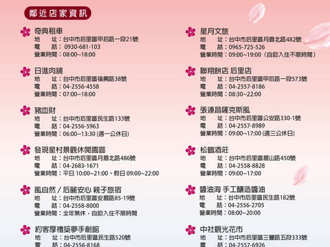 后里区长赖同一表示,后里山城观光资源丰富,举凡农特产品、古蹟步道、游乐园和酒庄等,产业形态丰富,邀请民众一同嚐美食、买好礼,感受台中春樱簇拥的粉红色魅力;另外,后里区公所提醒,赏樱期间维护环境清洁不易,除禁止违法设置流动摊贩外,请民众垃圾不落地,维护美好的赏樱品质。