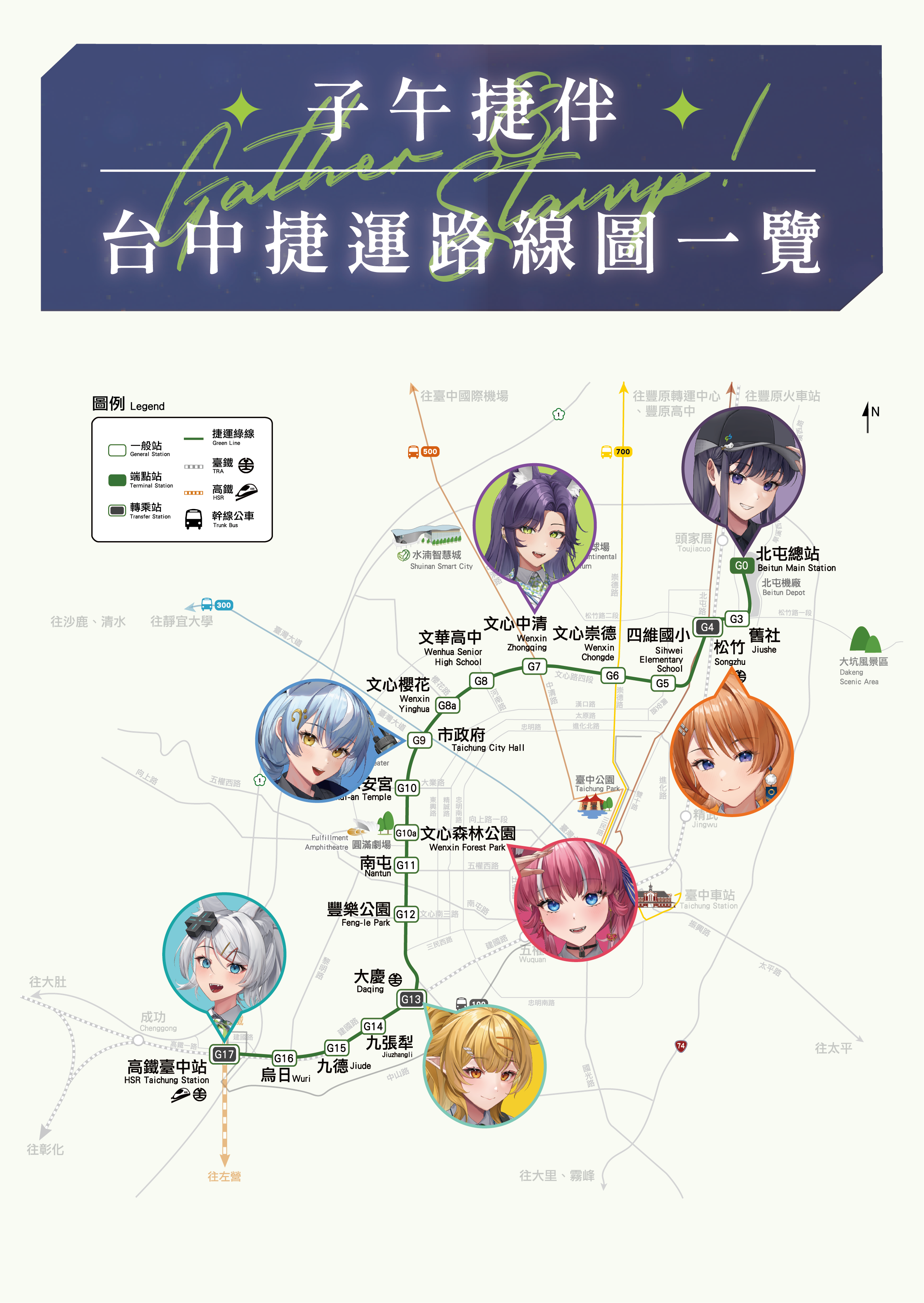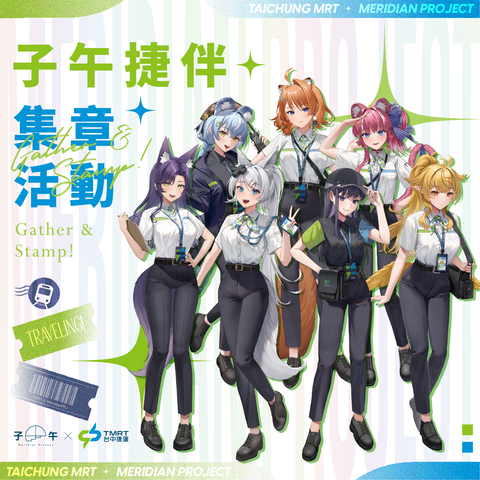 VTuber(虚拟实况主)影响力席卷网路世界,台中捷运公司与旗下有多位高人气VTuber的「子午计画」合作,首次结合VTuber,以主题站的概念举办「子午捷伴」游台中活动,民众於5月1日至7月31日在特定车站完成集章後,可兑换活动限定纪念品,还可以跟喜欢的VTuber合影,主题车站的贩卖机也贩售中捷与子午计画的联名商品,粉丝们绝对要收藏!
