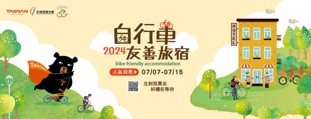 为鼓励国人骑乘自行车旅游及推广自行车友善旅宿之品牌,交通部观光署於113年7月7日至7月15日办理「2024自行车友善旅宿人气票选活动」,欢迎踊跃参与。(活动网址:https://bikefriendly.tad.gov.tw/)。相关照片