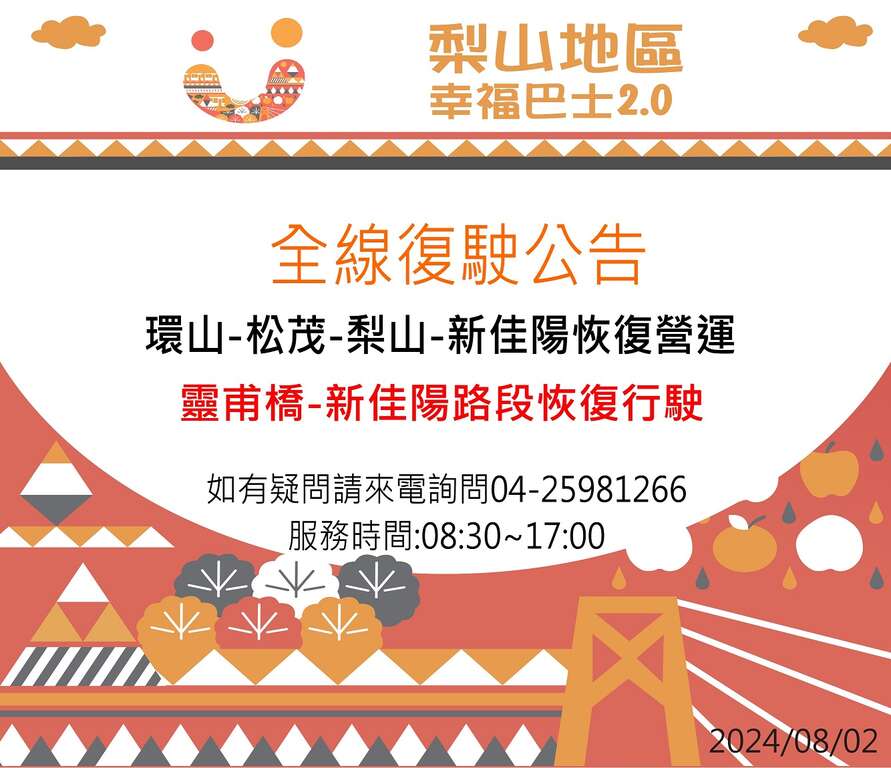 交通局长叶昭甫指出,受凯米台风挟带庞大雨量影响,一度造成梨山地区交通中断,工程单位全力抢修後已在近日开放全路段通行,原分阶段逐步营运的梨山幸福巴士也已全面恢复载客服务,包含往返梨山四大部落间的固定及弹性路线、南投县仁爱乡翠华村延驶路线、班次,全部正常上路。民众可透过梨山幸福巴士APP预约乘车,也可以拨打梨山社区发展协会进一步询问。
