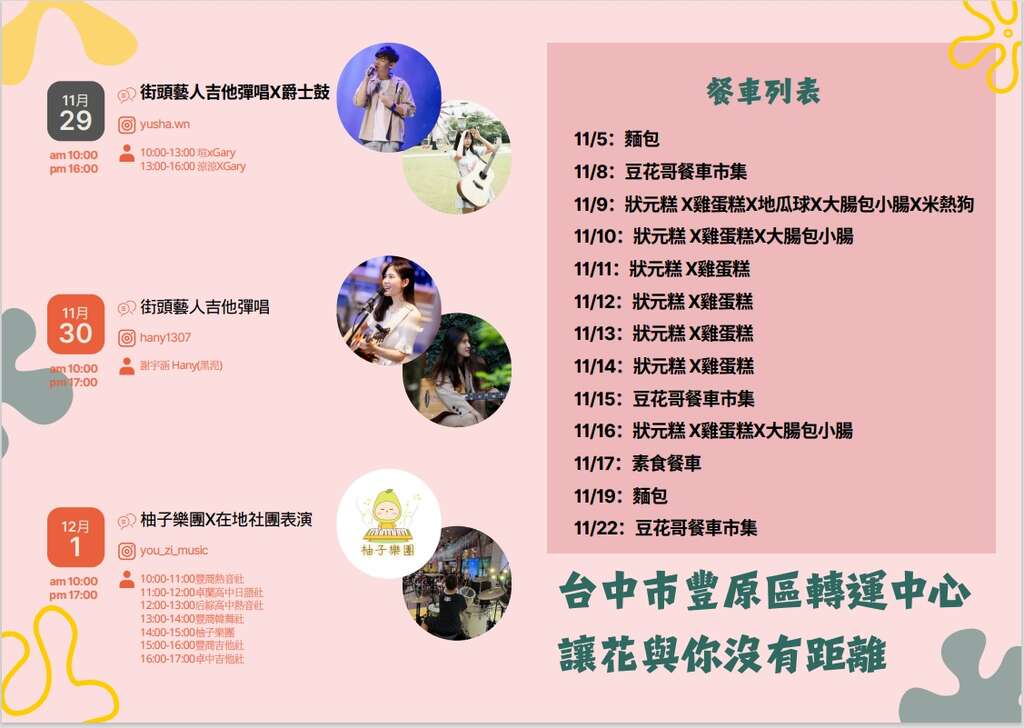 交通局指出,丰原转运中心营运厂商「台湾全聚德公司」将於11/8至11/17、11/19、11/22定期安排美味的市集餐车小吃,缤纷花海展出期间,还特别邀请艺文团体表演,包含乐团表演、街头艺人弹唱、萨克斯风、中国笛演奏、爵士鼓、南非鼓等一系列丰富的精彩节目,搭乘花海接驳车到站,不必急着赶行程,丰原转运中心以一系列活动热情招待,游客走访与花有约的轻旅行,也能感受台中独特的魅力。