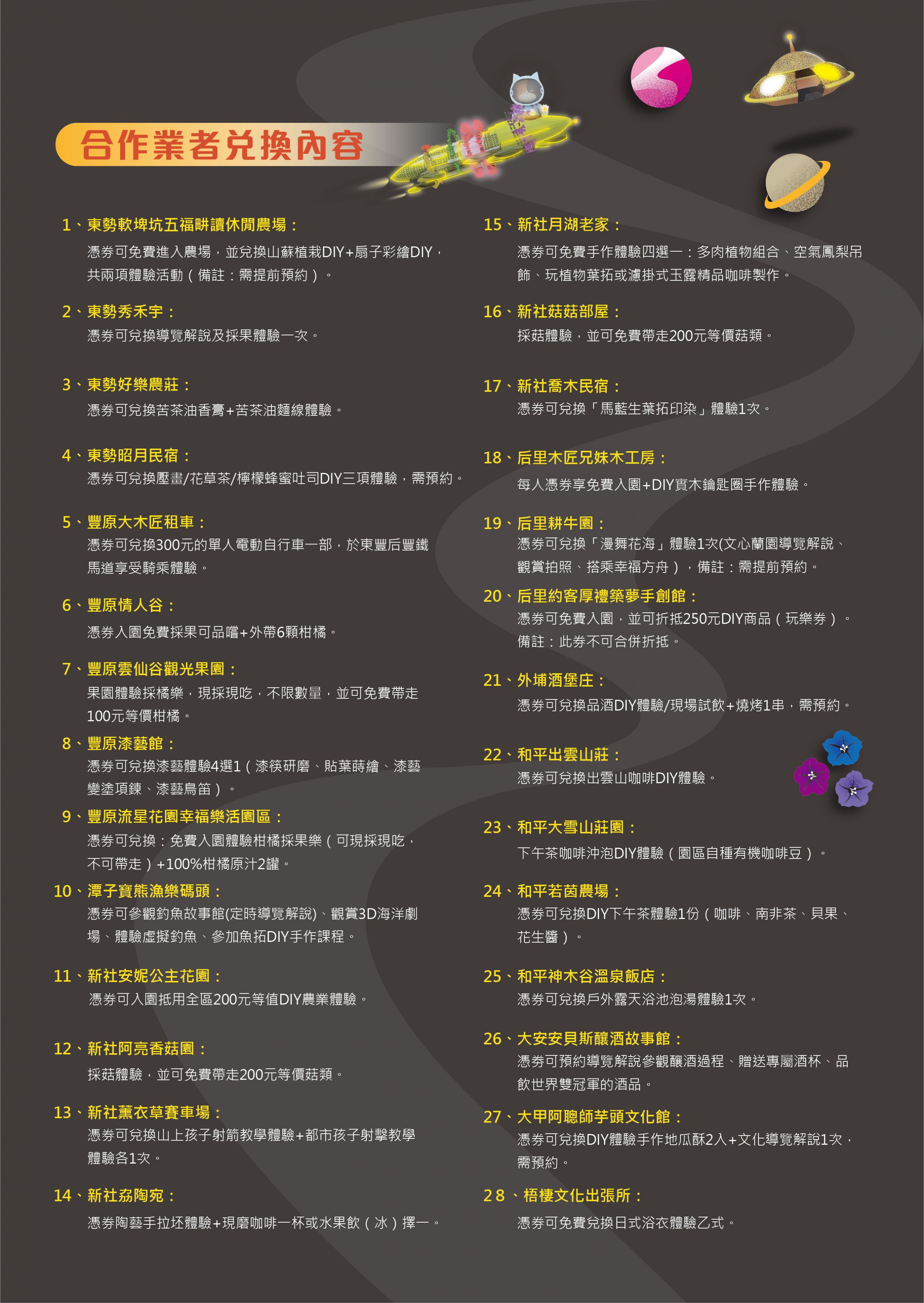 观旅局进一步说明,今年花毯节期间也特别和民宿协会合作,共同推出6大特色游程,於花毯节活动期间入住合作民宿,就有机会获取优质合作商家体验兑换券,共计有28家合作商家可供选择,兑换内容丰富,包括各式各样的观光工厂、民宿、农场等,让游客好吃、好玩又好拿,体验优惠的范围含新社、丰原、东势、石冈、和平、后里、大甲、大安等区,预计有1200名以上的名额,建议尽早预约订房,以免向隅,更多活动及住宿详情可至台中国际花毯节活动网站( https://www.flowercarpet.tw/download.php )、台中市民宿协会脸书粉丝团( https://www.facebook.com/share/p/1BMC4YENkt/ )及台中观光旅游网(https://travel.taichung.gov.tw/)