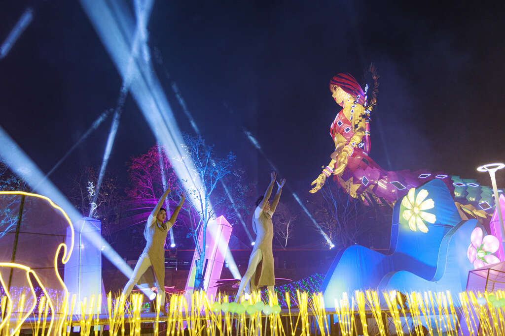 观旅局长陈美秀表示,中台湾元宵灯会是全台最大的单一场域灯会,自2023年移师中央公园举办以来,各方好评连连,以占地15公顷的公园地貌、水陆空串联的科技布景,让传统花灯工艺有更丰富、新颖的呈现。适逢中台湾元宵灯会届满25周年,今年的主灯展演更登峰造极,不仅是全台首座拟人化移动式展演主灯,更结合灯光、音效、表演艺术与AR扩增实境,营造出奇幻感与震撼感十足的沉浸式环境剧场!当高达12米、长达20米,栩栩如生的「女娲」在夜空中发出微光缓慢前移,转身环顾大地、抬手赐福众生,寓意在2025一起「蛇(实)现幸福」,围观群众无不惊叹:「来到现场真好看!」