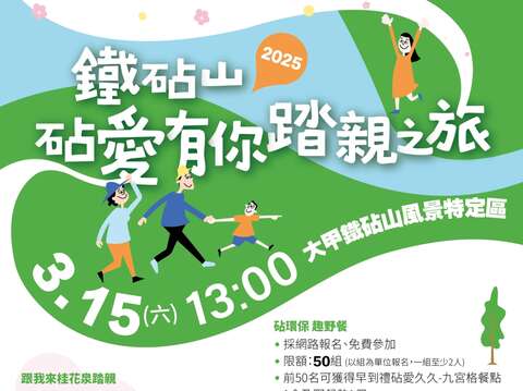 风管所补充,「铁砧山砧爱有你踏亲之旅」首先开跑的是3月1日至14日的「寻找真爱密码线上抽奖」,活动期间在铁砧山自行车道旁的自行车架,找到6处真爱密码线上登记抽奖看板,民众至指定6处打卡点其中1处扫QR code完成网路抽奖登记,即可参与线上抽奖;每1打卡点限打卡1次,将抽出30名幸运儿,可随机获得清新温泉、神木谷温泉等知名饭店温泉泡汤券,让这满满幸福的季节增添更多浪漫氛围。