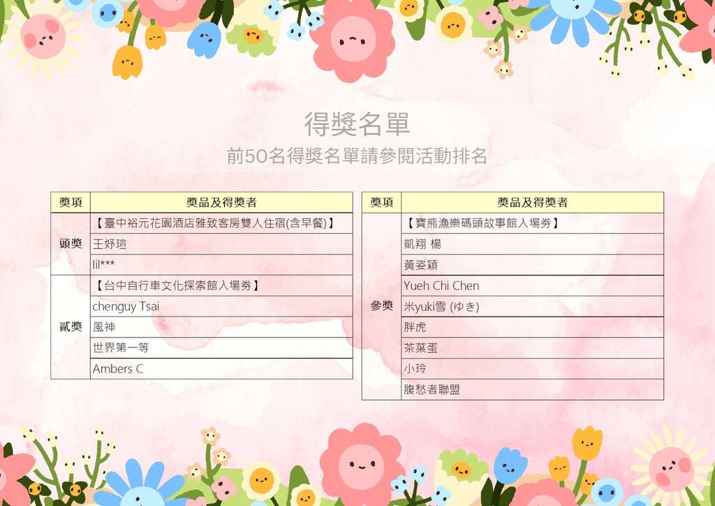 🏆 排名竞赛,还有抽奖好礼~台中裕元花园酒店雅致客房住宿券(含早餐)(2名)、自行车文化探索馆入场券(4名)、宝熊渔乐码头故事馆入场券(8名),等你拿!🎁
