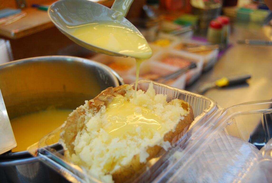 一家之薯选用美国进口的褐皮马铃薯,在200度高温下烧烤约四十分钟,随即放入另一个烤炉降温,点用时再取出切开掏松,淋上独家酱汁(起司粉、玉米粉、糖、盐、独家秘方),和事先预备好的新鲜材料,像是火腿、燻鸡一起排在上面,就算大功告成。