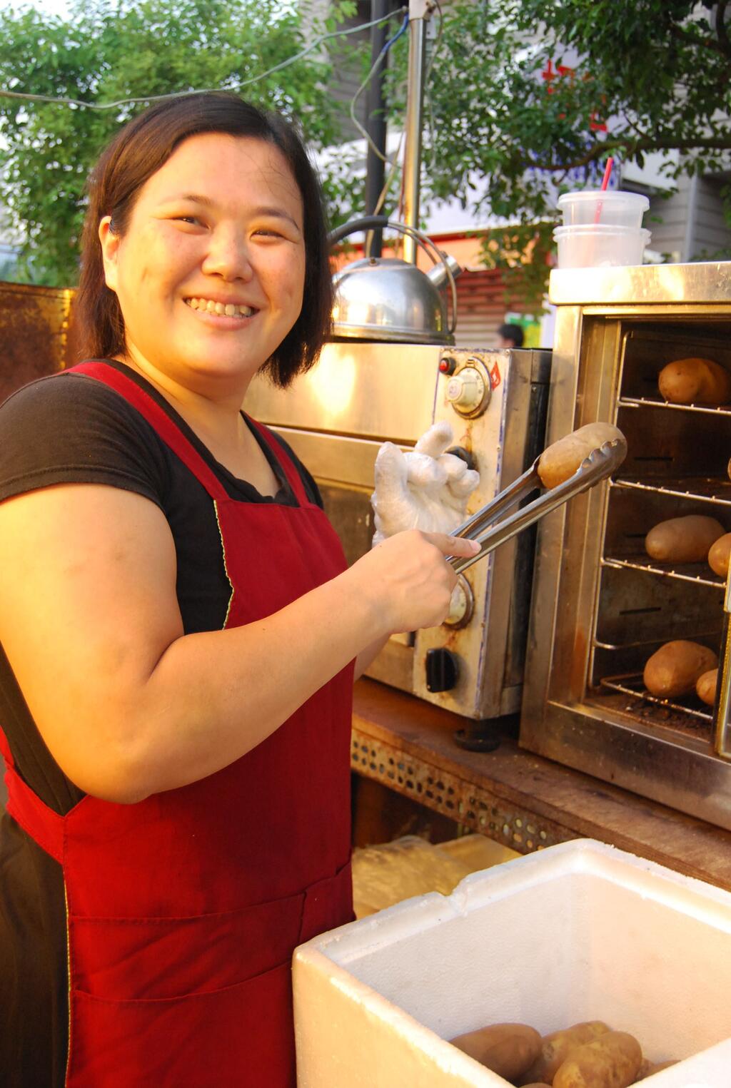 台中市逢甲夜市文华路富有小吃一条街之称,最近在旗舰夜市专区对面开了一间香喷喷的现烤马铃薯店,经附近店家介绍後才知道,这间店的老板张绍明身藏不露,多年前还是台中通豪饭店的厨师,看准现烤马铃薯独特的魅力,抱着热情从彰化夜市进入逢甲,抢攻这个号称台湾最大夜市市场。