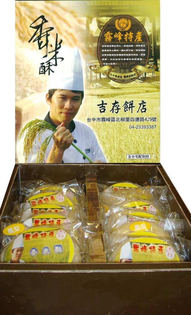 霧峰香米酥聞名台灣,外酥內軟Q的獨特風味,香米有芋頭香味而聞名,餅皮使用紐西蘭進口奶油精心調製,酥鬆且多層次,再融入細火慢熬六小時的麥芽加入香米而口味獨特,深知台灣每年因為颱風使農民受災嚴重,感念農民辛苦特採用嚴選霧峰香米精製,用最天然的食材,讓美味兼顧健康是最佳伴手禮的首選。
